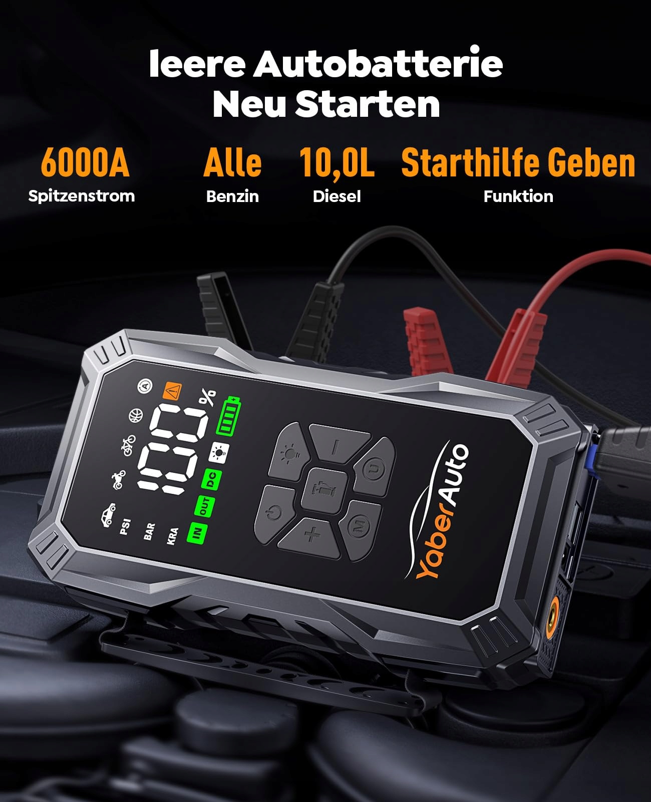 YaberAuto Powerbank do rozruchu samochodu z kompresorem, 150PSI 6000A Rozrusznik samochodowy, 23800mAh Powerbank do rozruchu, Rozrusznik (Wszystkie silniki benzynowe i 10.0L Diesla) z wyświetlaczem LCD i 500 lumenów światła awaryjnego
