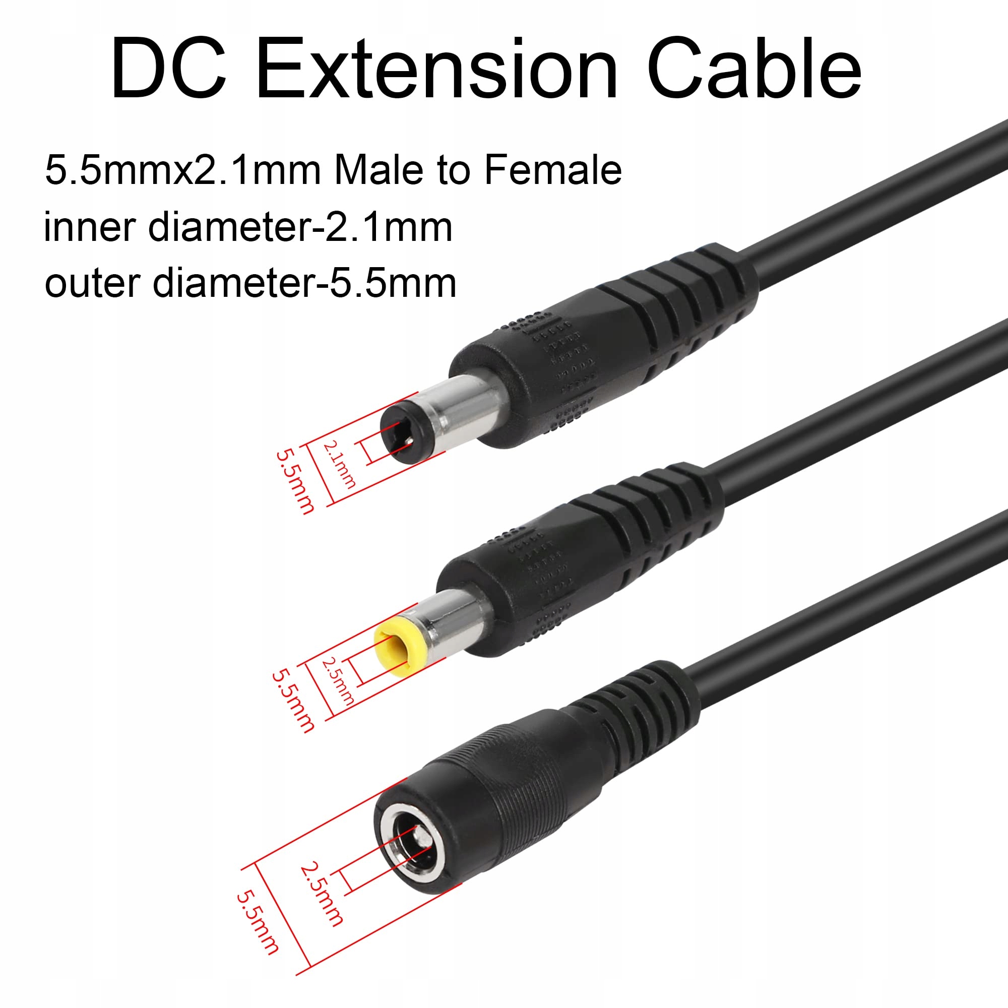 Przedłużacz DC, 5,5 x 2,5 mm, 1 gniazdo na 2 wtyki, kabel rozdzielający, 2-kierunkowy kabel prądu stałego, rozdzielacz Y, może zasilać urządzenia DC z gniazdami 2,5 mm x 5,5 mm. Kabel rozdzielający Y, średnice wewnętrzne 2 męskich końcówek to: 2,5 mm i 2,1 mm; może zasilać urządzenia DC z odpowiednimi gniazdami.