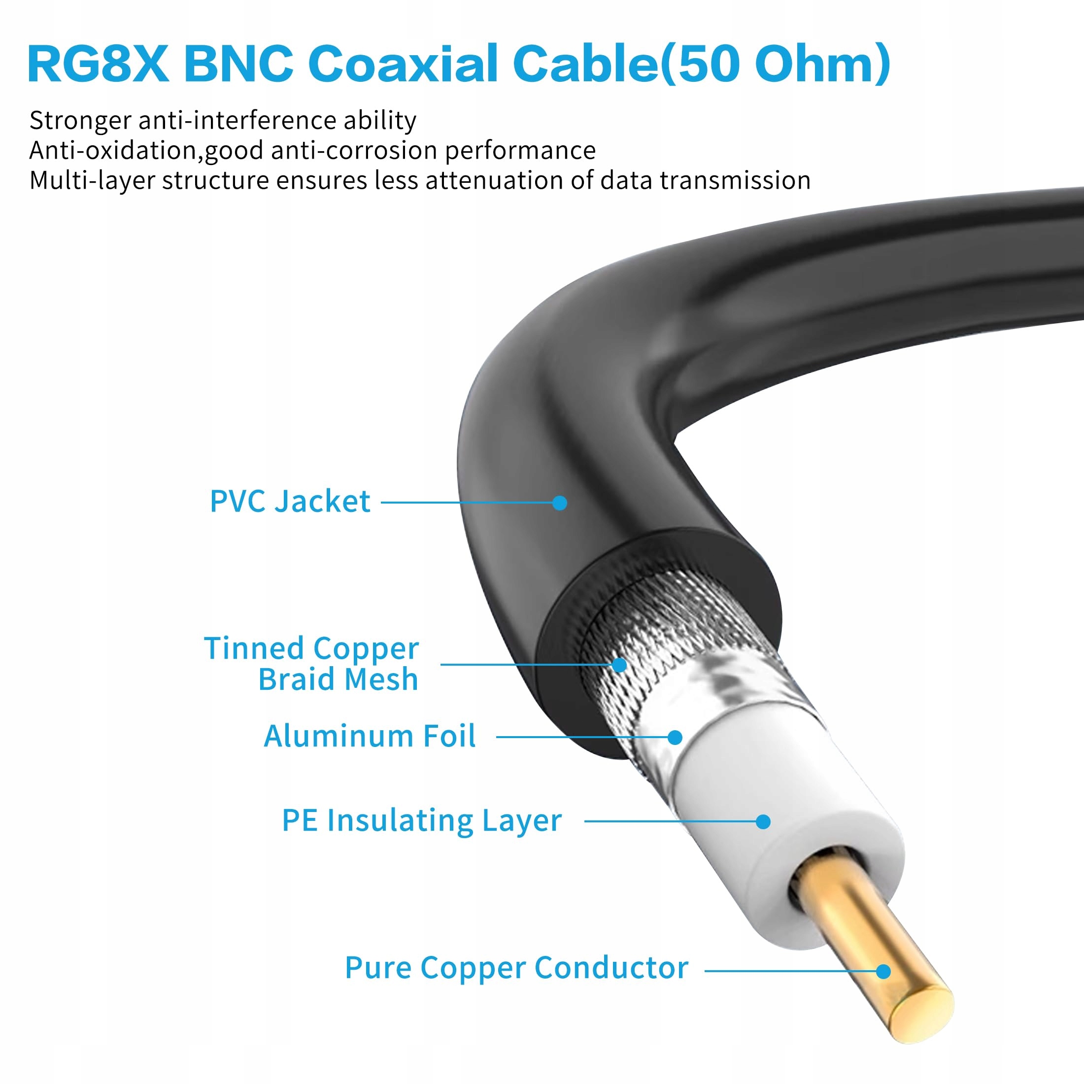 Najwyższa jakość - wtyki BNC wykonane są z wytrzymałej miedzi, co zapewnia odporność na korozję, brak utraty sygnału oraz odporność na zakłócenia EMI/RFI. 24-karatowo pozłacane styki dla lepszego połączenia przewodnika i stabilności. Ulepszona powłoka PVC sprawia, że kabel jest bardziej trwały i elastyczny, co ułatwia jego prowadzenie przez ściany, sufity, poddasza i rury.