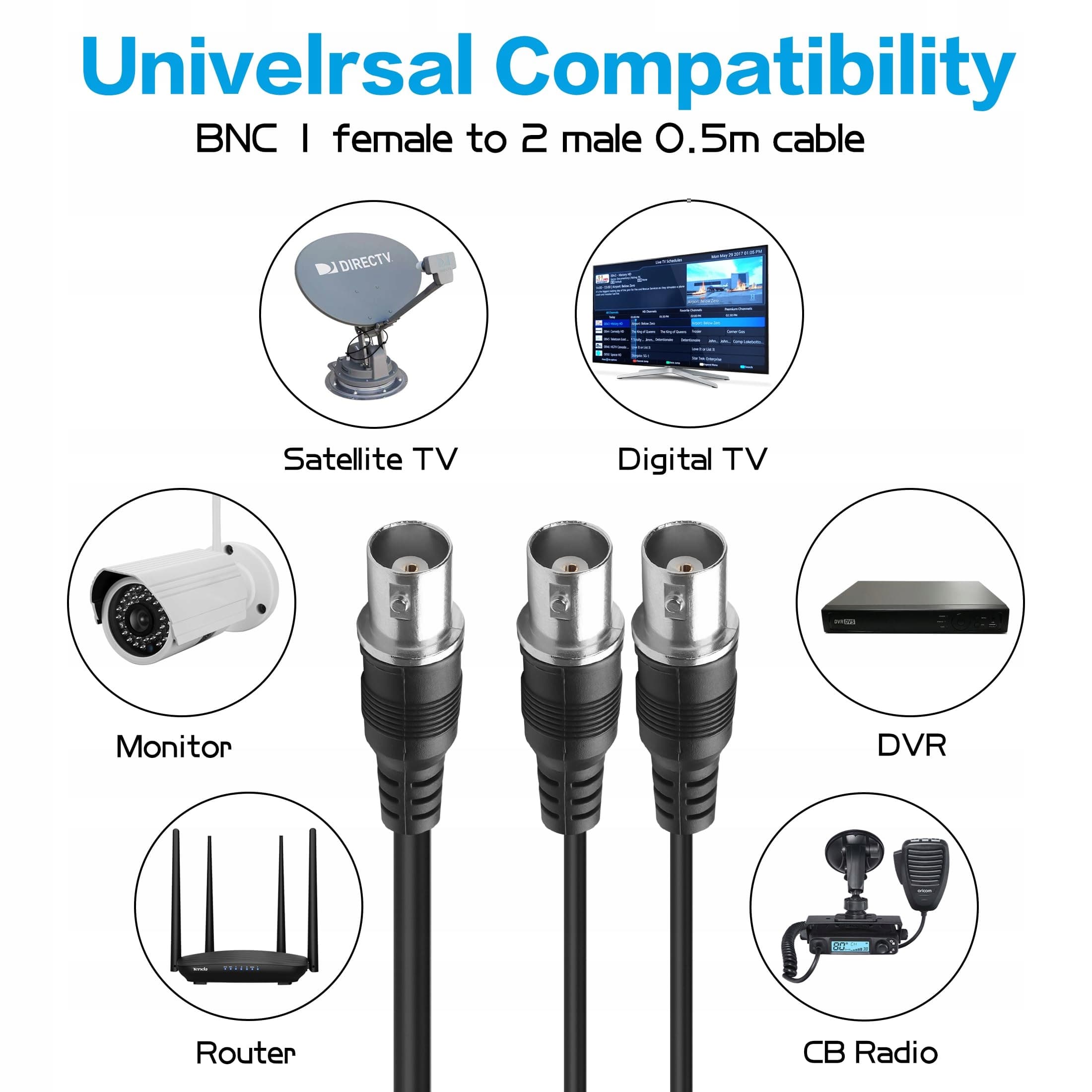 Szerokie zastosowanie - kable rozdzielające BNC są używane do rozdzielania sygnałów z anten, systemów zabezpieczeń (kamery CCTV, rejestratory DVR) i innych urządzeń, szeroko stosowane w transmisji sygnałów wideo/audio, transmisji sygnałów HF, podłączeniach telewizyjnych oraz innych systemach CCTV, kamerach bezpieczeństwa, skanerach, systemach wideo.