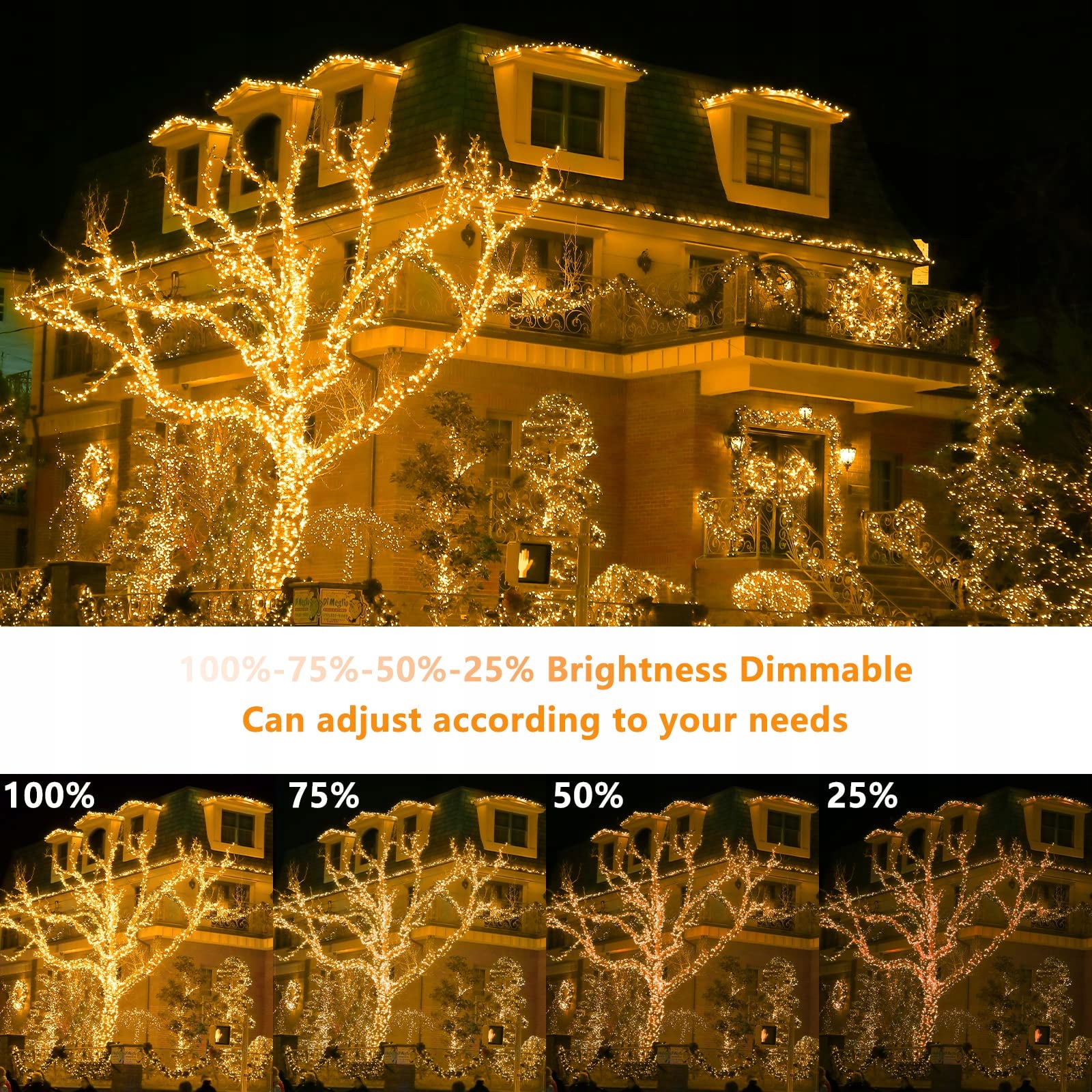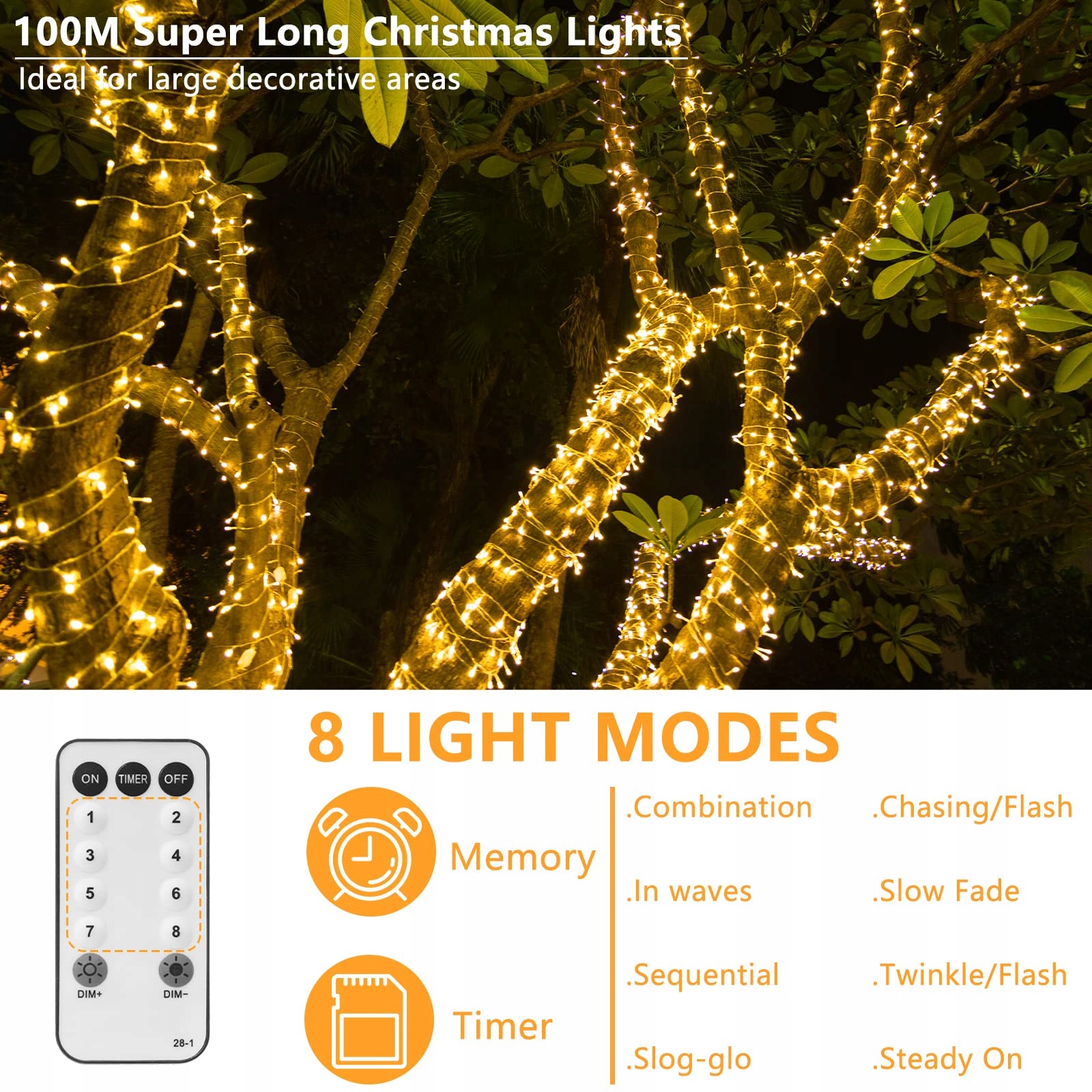 [Co otrzymujesz] 100m oświetlenia świątecznego zewnętrznego, adapter, instrukcję obsługi i pilot.