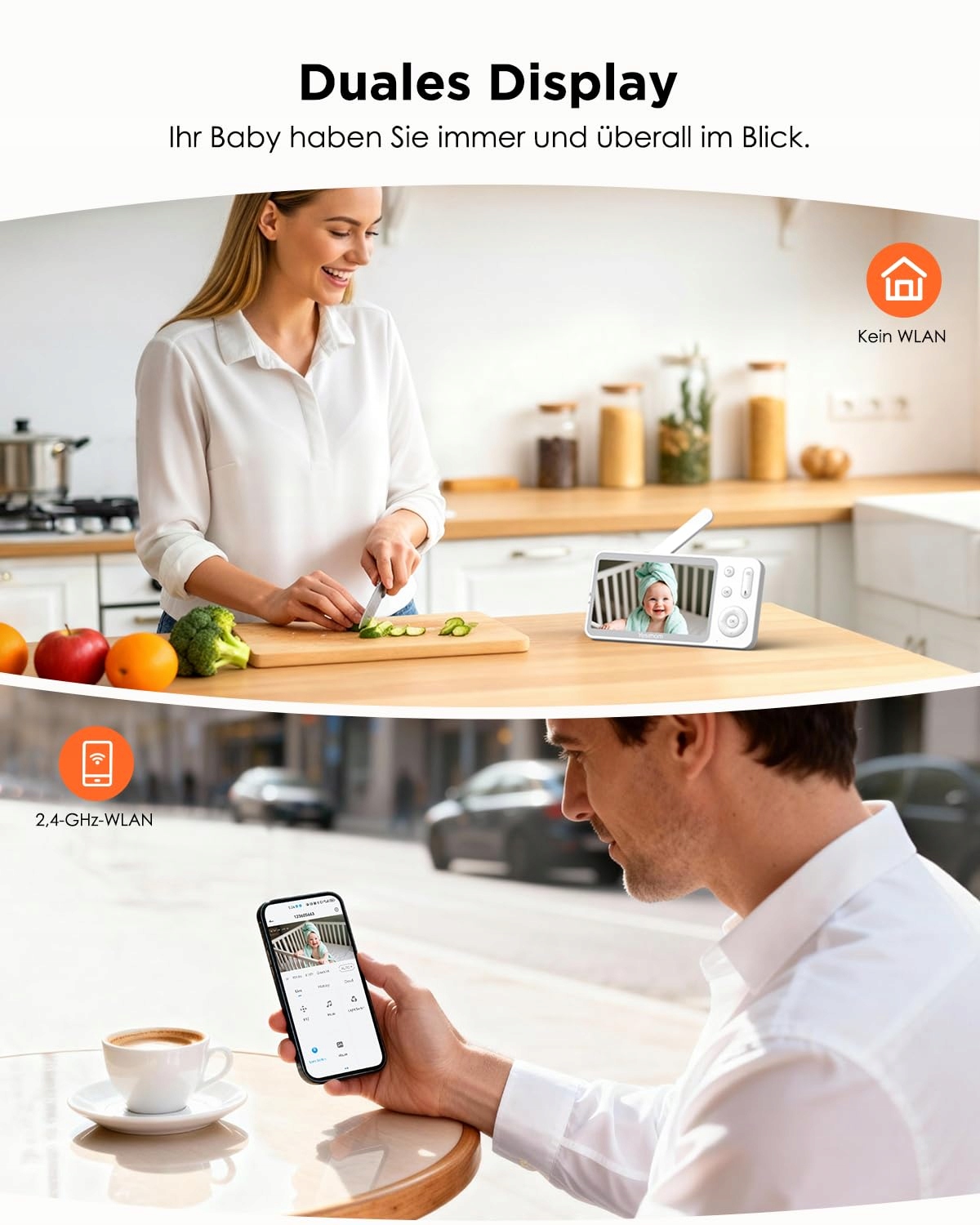 【Bez WLAN lub 2,4G WLAN monitoringu】5-calowy babyfon z kamerą i aplikacją – łączy się z monitorem LCD (sygnał 1000 stóp/bez WLAN) oraz mobilną aplikacją (wymagany WLAN). Wyposażony w niskoczęstotliwościowy chip WLAN 868 MHz dla rozszerzonego zasięgu transmisji i stabilniejszego połączenia. Nowoczesna technologia szyfrowania zapewnia prywatność i bezpieczeństwo. Monitoruj bezpieczeństwo swojego dziecka w każdej chwili i miejscu.