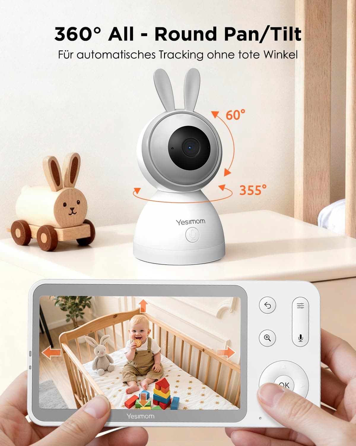 YESIMOM Babyfon z kamerą 2K/3MP, 5" IPS WLAN Video Babyfon z aplikacją, PTZ 360°, IR noktowizja, automatyczne śledzenie, wykrywanie płaczu/ruchu/dźwięków, alarm strefowy, wyświetlacz temperatury
