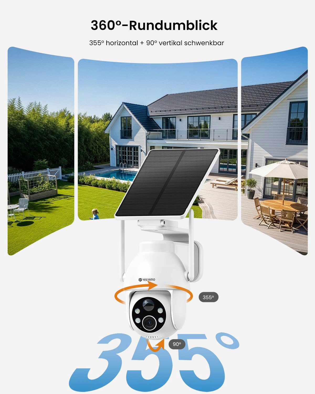 YESYAMO 2K Kamera monitoringu zewnętrznego solarna - 360° PTZ Kamera monitoringu z akumulatorem, 2,4 GHz kamera WLAN z czujnikiem ruchu PIR, kolorowe widzenie nocne, dwukierunkowe audio