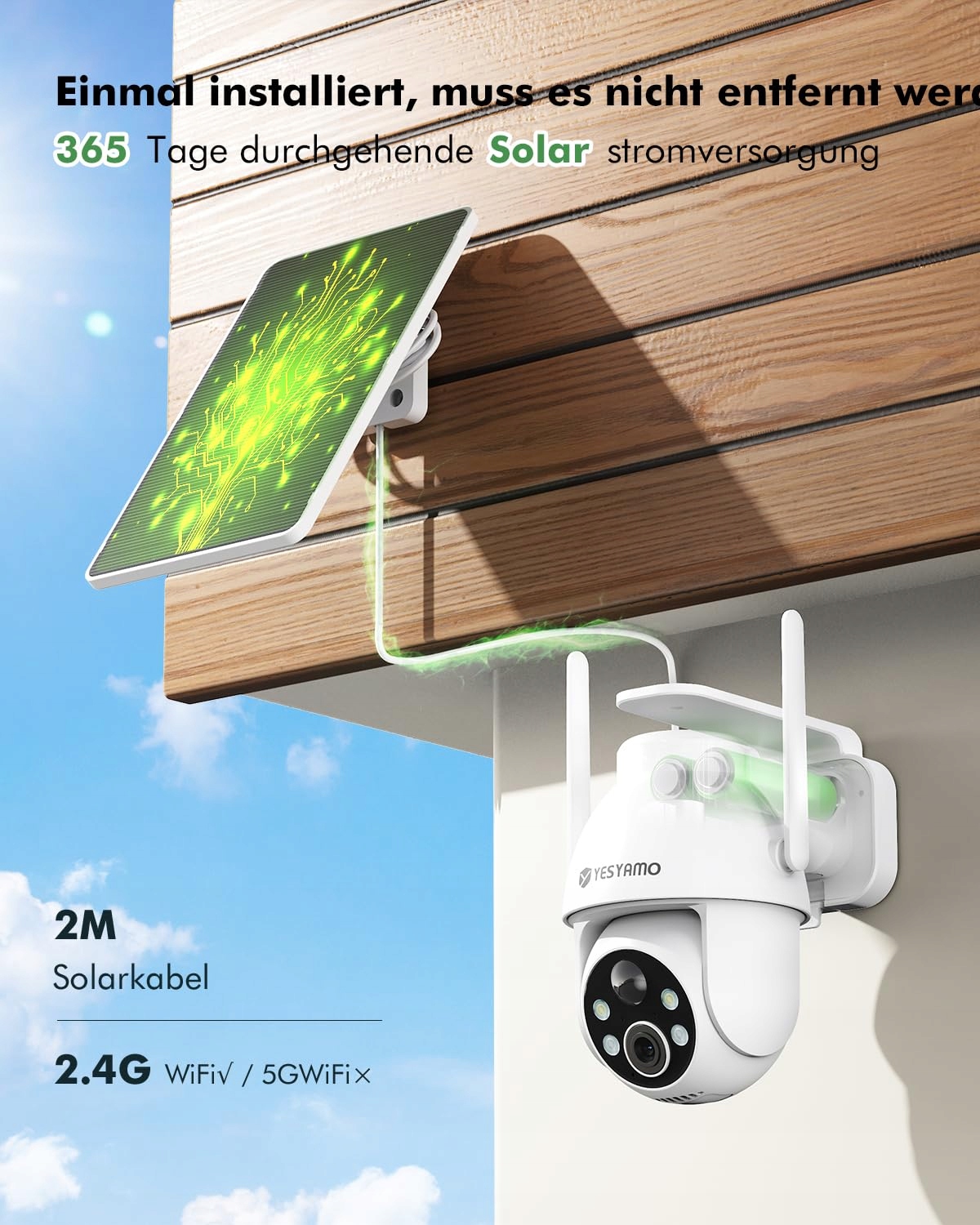 YESYAMO 2 sztuki 2K kamera monitoringu zewnętrznego solarna, kamera WLAN na zewnątrz, 2,4 GHz, kamera solarna z panelem solarnym, 360 ° PTZ, widzenie nocne, dwukierunkowe audio