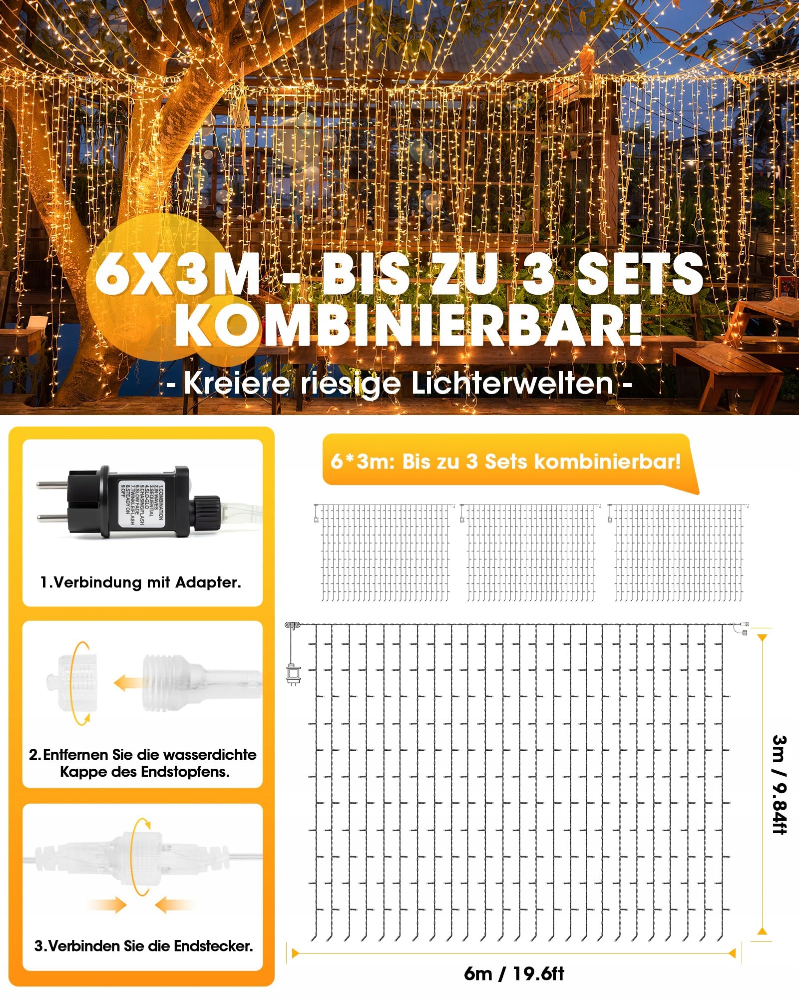 ✨【600 LED zasłona świetlna】- Zasilane z sieci świąteczne światła okienne z 600 wysokiej jakości diodami LED, żywsze i piękniejsze niż inne podobne łańcuchy świetlne zasilane przez USB, które mają tylko 600 diod LED. Idealne do użytku wewnątrz i na zewnątrz, doskonałe do dekoracji na wesela, imprezy, oświetlenie świąteczne i codzienne upiększanie przestrzeni mieszkalnej