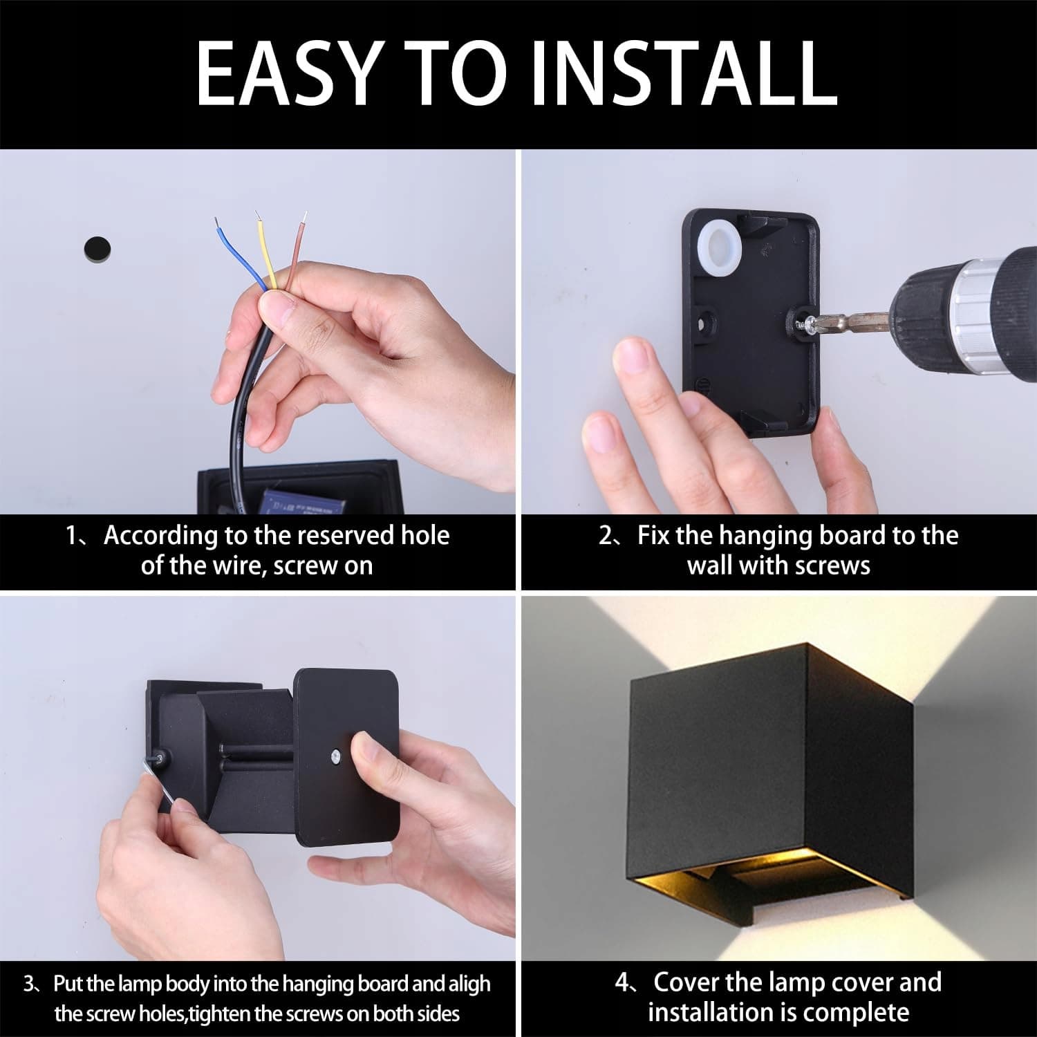 IP65 wodoodporna: Nasze zewnętrzne lampy ścienne są wodoodporne zgodnie z normą IP65, dzięki czemu idealnie nadają się do różnych trudnych warunków pogodowych oraz szerokiego zakresu zastosowań wewnątrz i na zewnątrz, takich jak klatki schodowe, salony, balkony, korytarze, ogrody i tarasy.