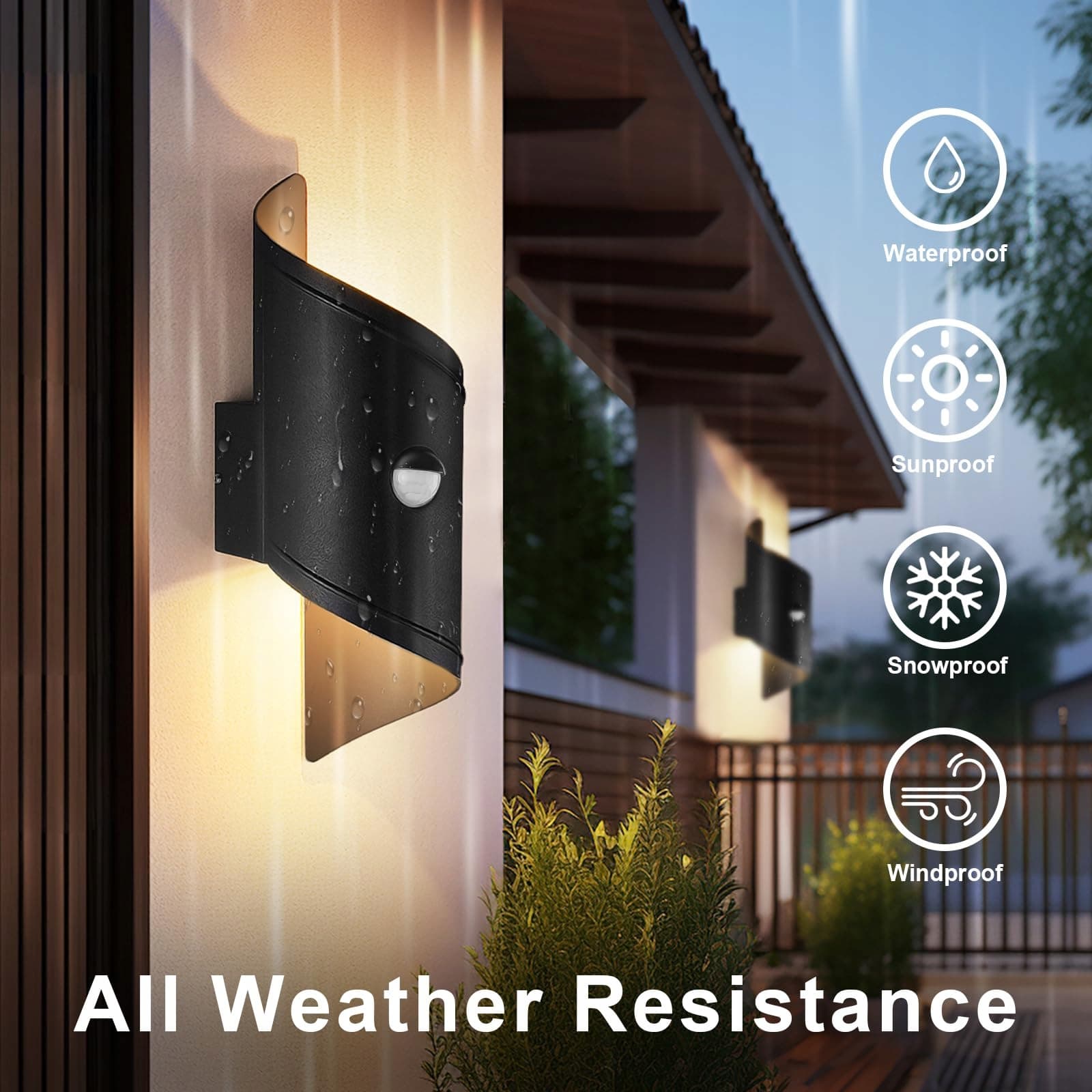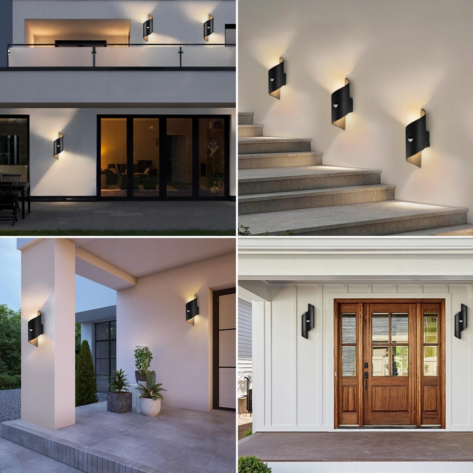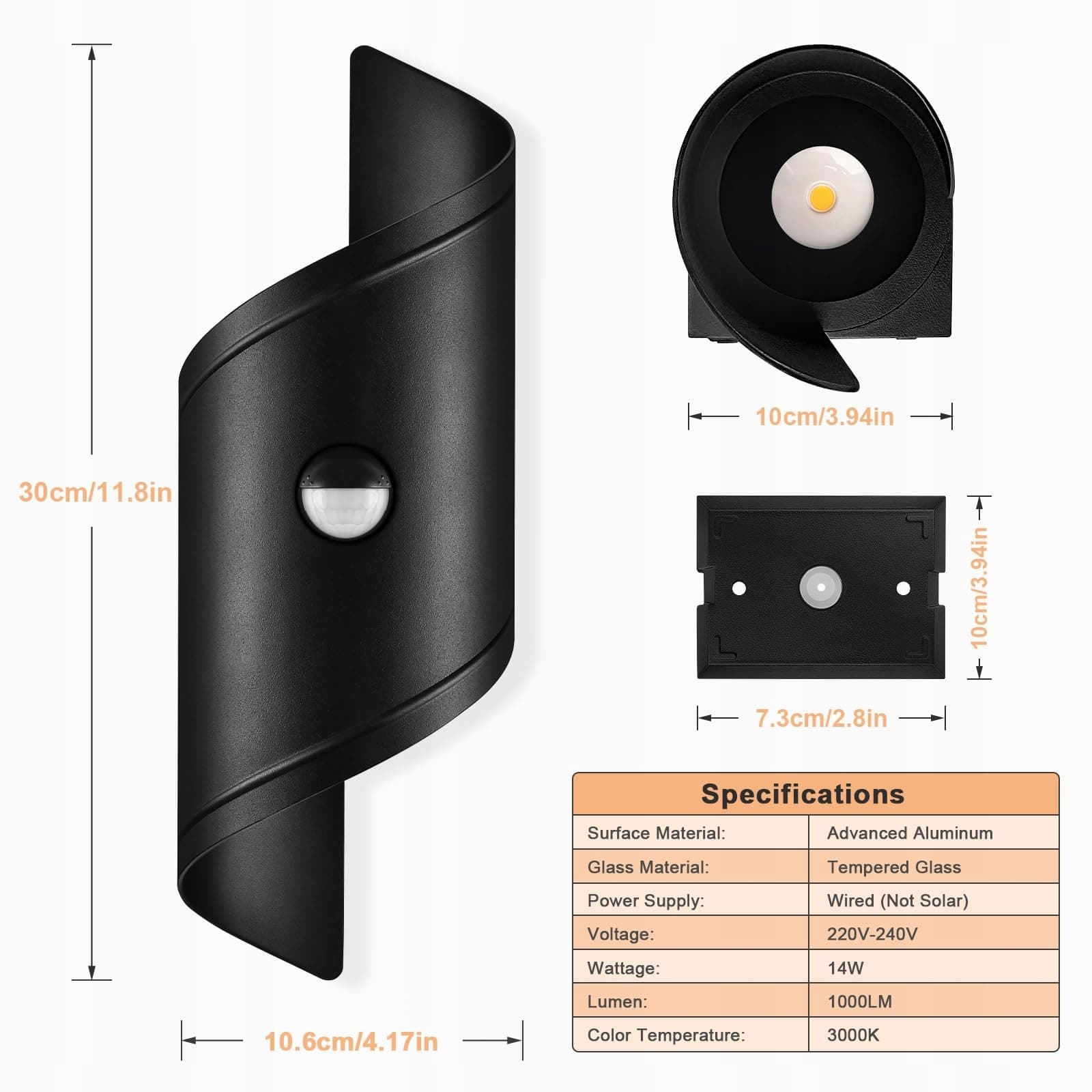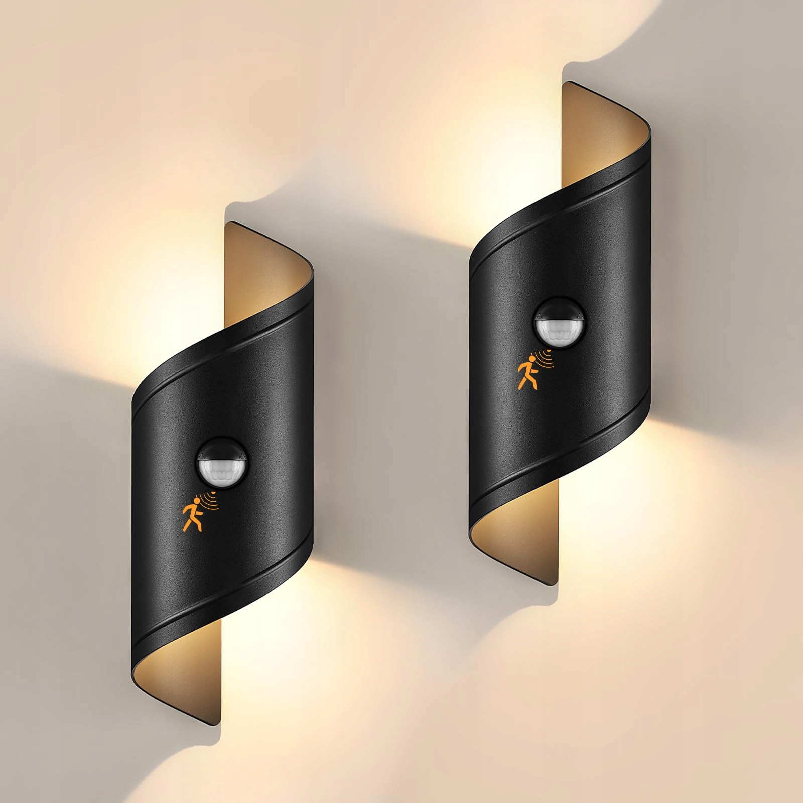 YindaLux LED Lampa zewnętrzna z czujnikiem ruchu, 14W 2 sztuki kinkietów do wnętrz/na zewnątrz, IP65 wodoodporna lampa zewnętrzna góra-dół 3000K ciepła biel, nowoczesny aluminiowy kinkiet zewnętrzny na balkon, czarny