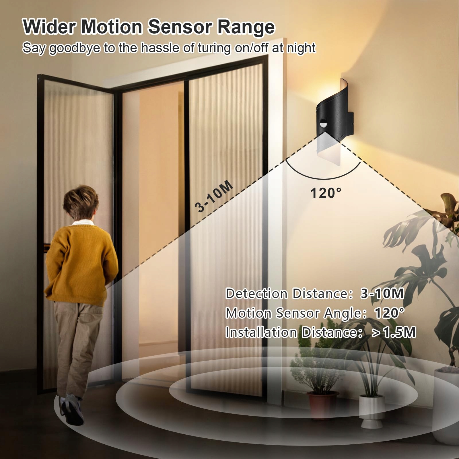 Czuły czujnik ruchu: Nasze kinkiety zewnętrzne mogą wykrywać ruch w kącie 120° i zasięgu 3-10 m. Kinkiet włącza się automatycznie po wykryciu ruchu (czas świecenia można ustawić od 5 s do 12 min) i wyłącza się, gdy ruch zanika. Dodatkowo możesz wybrać ten tryb za pomocą ustawienia czułości światła, aby działał tylko w nocy lub przez cały dzień.