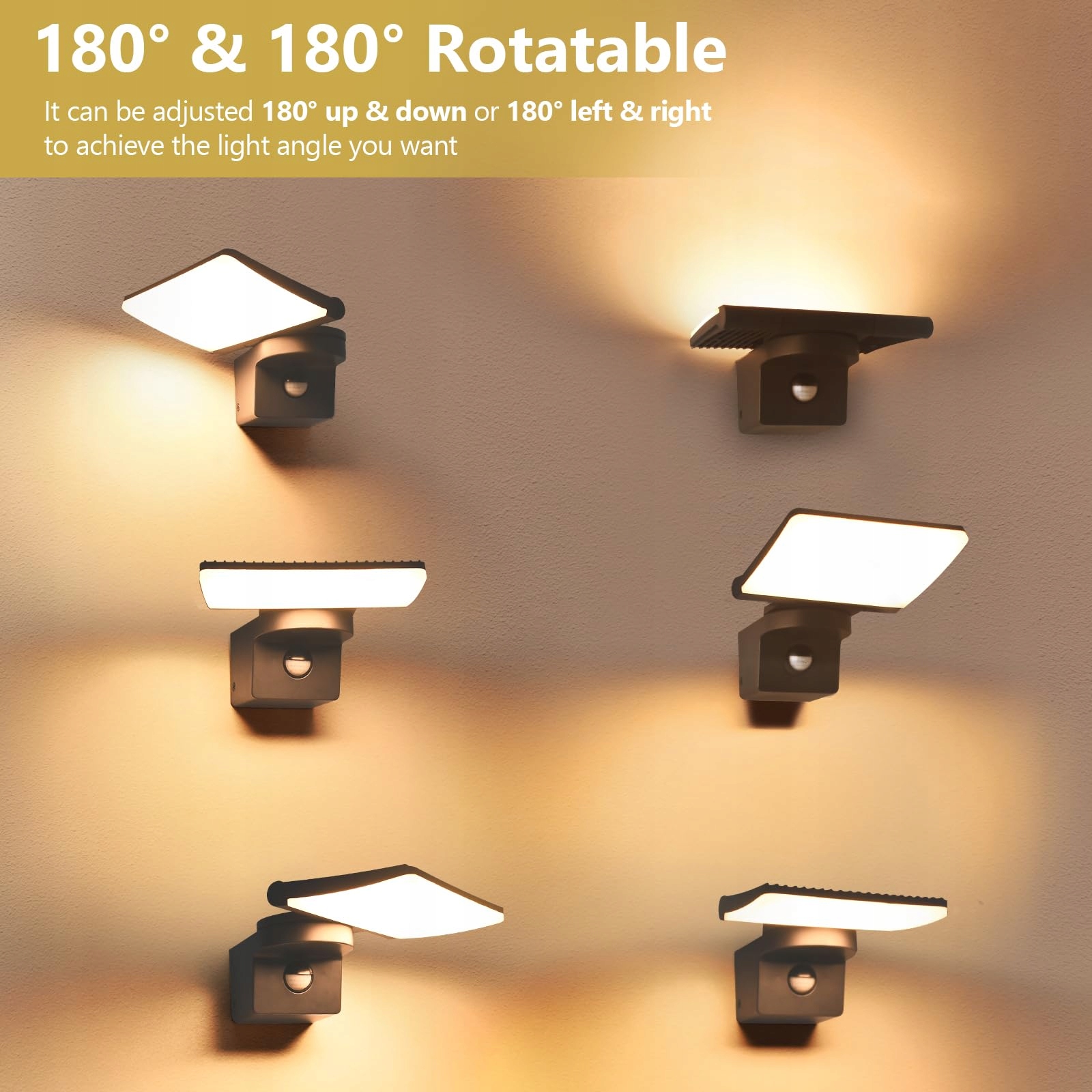 Obrotowa głowica i precyzyjne oświetlenie: Nasze lampy zewnętrzne z czujnikiem ruchu mają obrotową głowicę, obracającą się swobodnie o 180° w pionie i 180° w poziomie, co ułatwia ustawienie kierunku strumienia światła, dokładnie oświetlając każde miejsce, którego potrzebujesz (ogród, balkon, tabliczki przy drzwiach, schody, ścieżki itp.), aby spełnić różnorodne wymagania oświetleniowe.