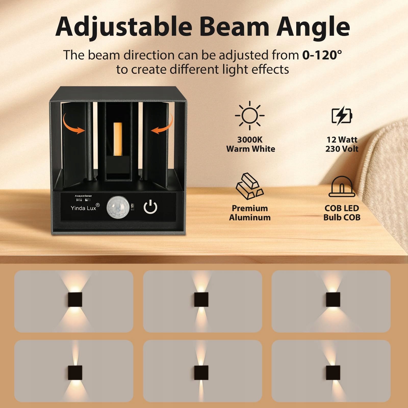 Regulowany kąt świecenia: Nasza lampa zewnętrzna z czujnikiem ruchu ma prosty design z matowoczarnymi, wbudowanymi, ukrytymi skrzydełkami lampy, które można ustawić w zakresie 0-120°, dzięki czemu można swobodnie wybierać różne obszary oświetlenia. Połączona z ciepłym światłem o temperaturze 3000 K, nie tylko tworzy przytulną atmosferę, ale także doskonale pasuje do każdego stylu dekoracji, idealna do salonu, sypialni, dziedzińców, ogrodów i innych miejsc.