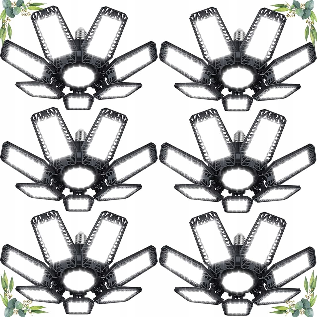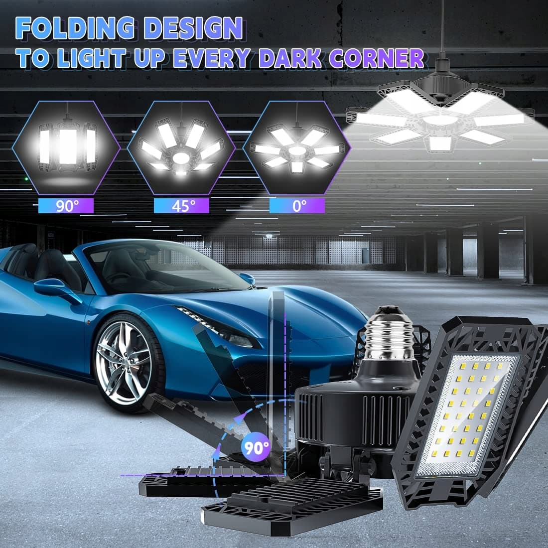 🍀[7 regulowanych paneli & składana konstrukcja]: Oświetlenie 360°, każdy ciemny kąt może być jasno oświetlony przez 7 regulowanych paneli. Panele lampy sufitowej LED można składać od 0° do 90°, a Ty możesz ustawić kierunek oświetlenia według własnych potrzeb, śruba w lampie garażowej LED zapewni pokrycie światłem w zakresie 360°