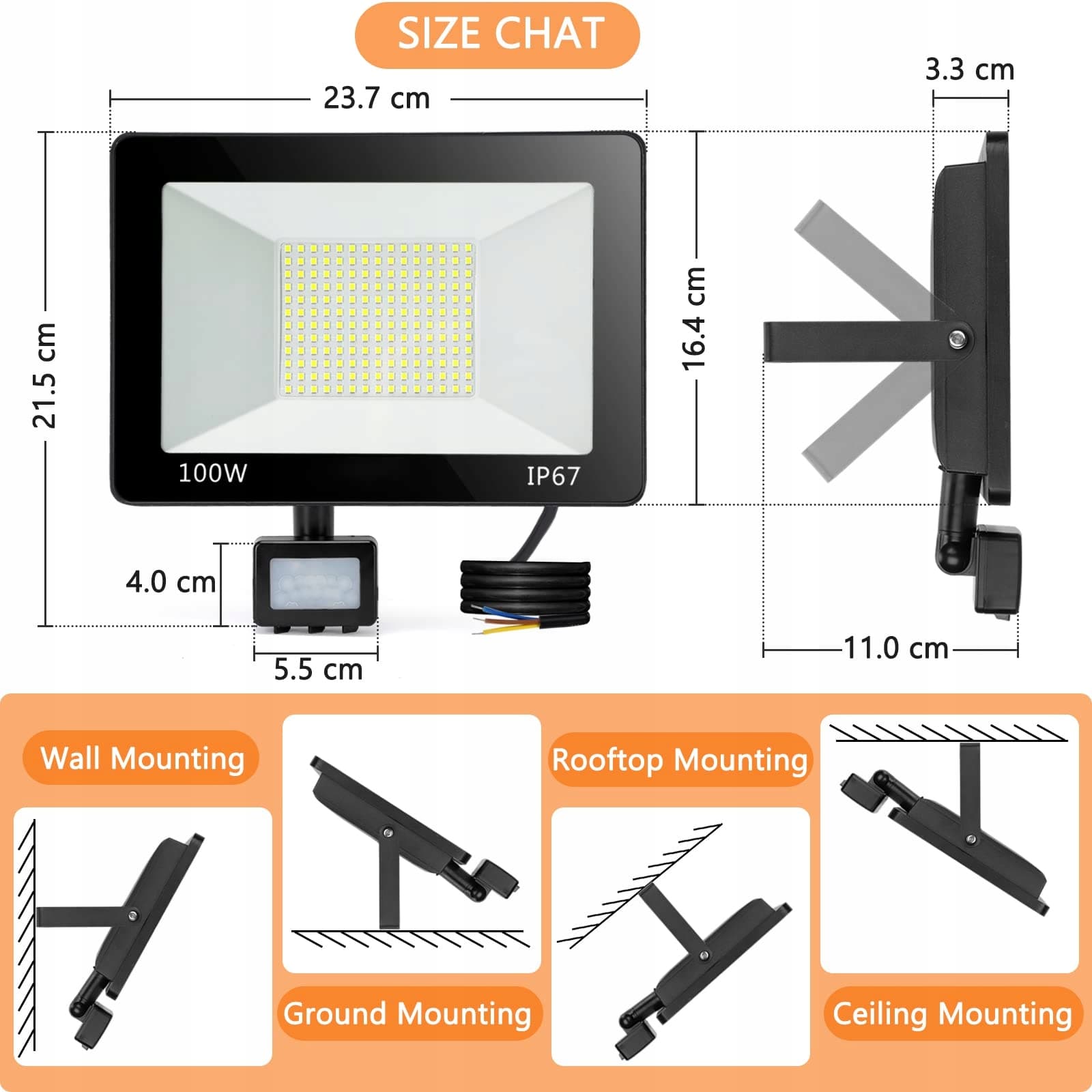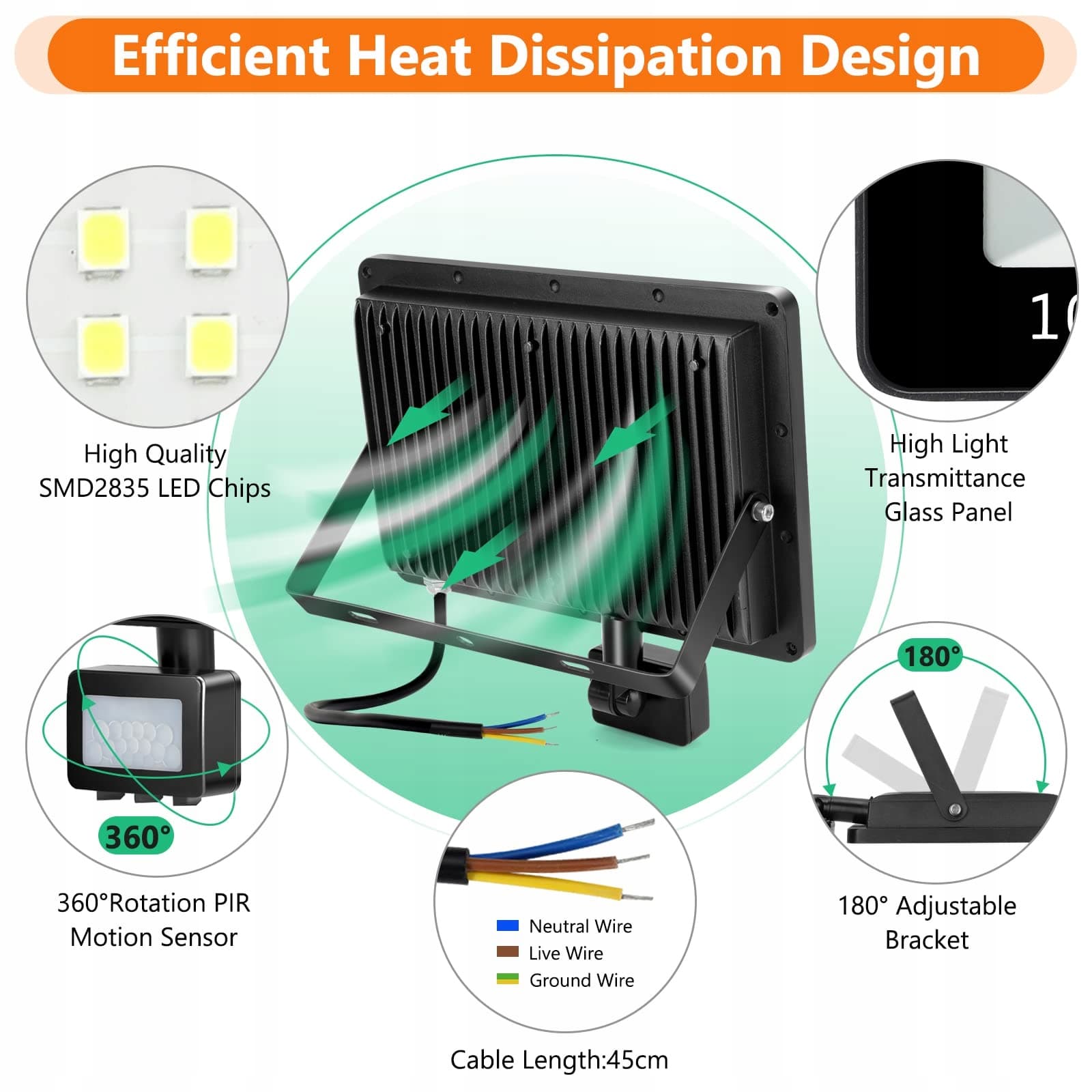 Bardzo jasny i energooszczędny reflektor LED 100W na zewnątrz: Nowa ulepszona lampa zewnętrzna LED z czujnikiem ruchu jest wyposażona w 180 wysokiej jakości chipów LED SMD2835, oferujemy dwukrotnie więcej wysokiej jakości diod LED w porównaniu do innych starszych reflektorów LED. Nasz reflektor LED może generować jasność do 10000lm, jest jaśniejszy i oszczędza ponad 85% energii, co jest znacznie niższym zużyciem w porównaniu z tradycyjnymi halogenowymi lampami zewnętrznymi, nie trzeba już martwić się wysokimi kosztami energii.