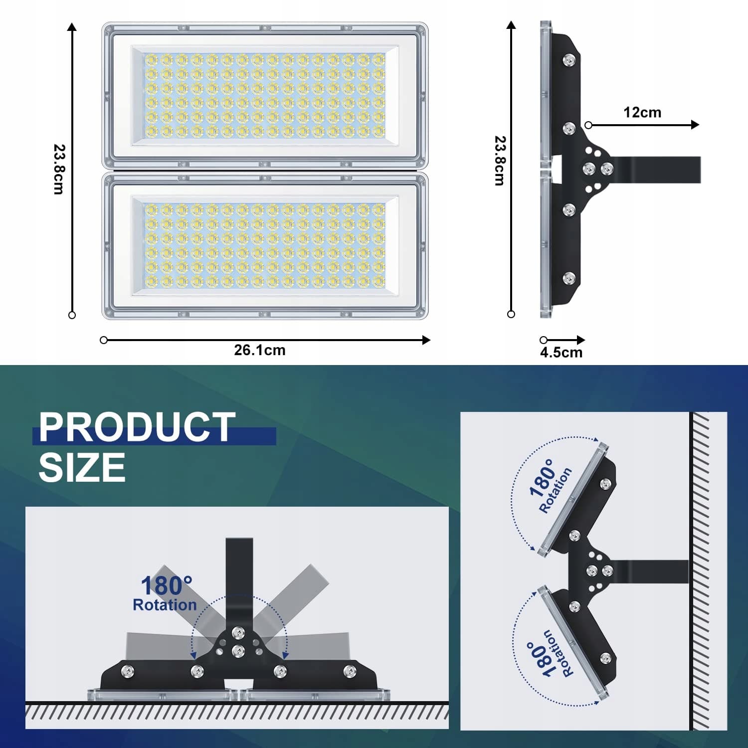 ️Elastyczny montaż: Reflektor LED jest wyposażony w metalowy uchwyt regulowany o 180° oraz elementy łączące obracane o 180°, dzięki czemu możesz rozszerzyć oświetlany obszar, ustawiając go pod różnymi kątami. Ten innowacyjny modułowy reflektor LED może być używany nie tylko jako reflektor 200W, ale także może zostać podzielony na 2 reflektory LED 100W. Możesz używać ich pojedynczo lub w połączeniu, w zależności od potrzeb.