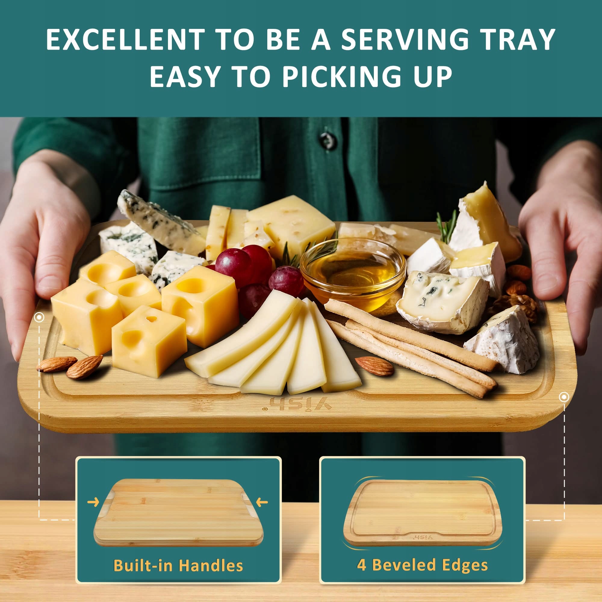 DOSKONAŁE JAKO TACA SERWISOWA: Może być używana jako taca do serwowania serów i wędlin, ponieważ ma 2 boczne uchwyty i 4 ścięte krawędzie, co ułatwia podnoszenie, nawet gdy deska do krojenia drewniana leży na płaskim blacie. Jest wygodna w noszeniu i dobrze się prezentuje.