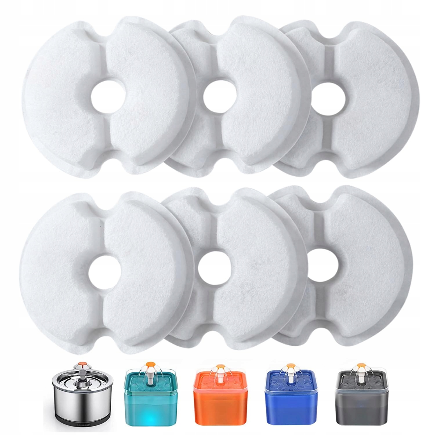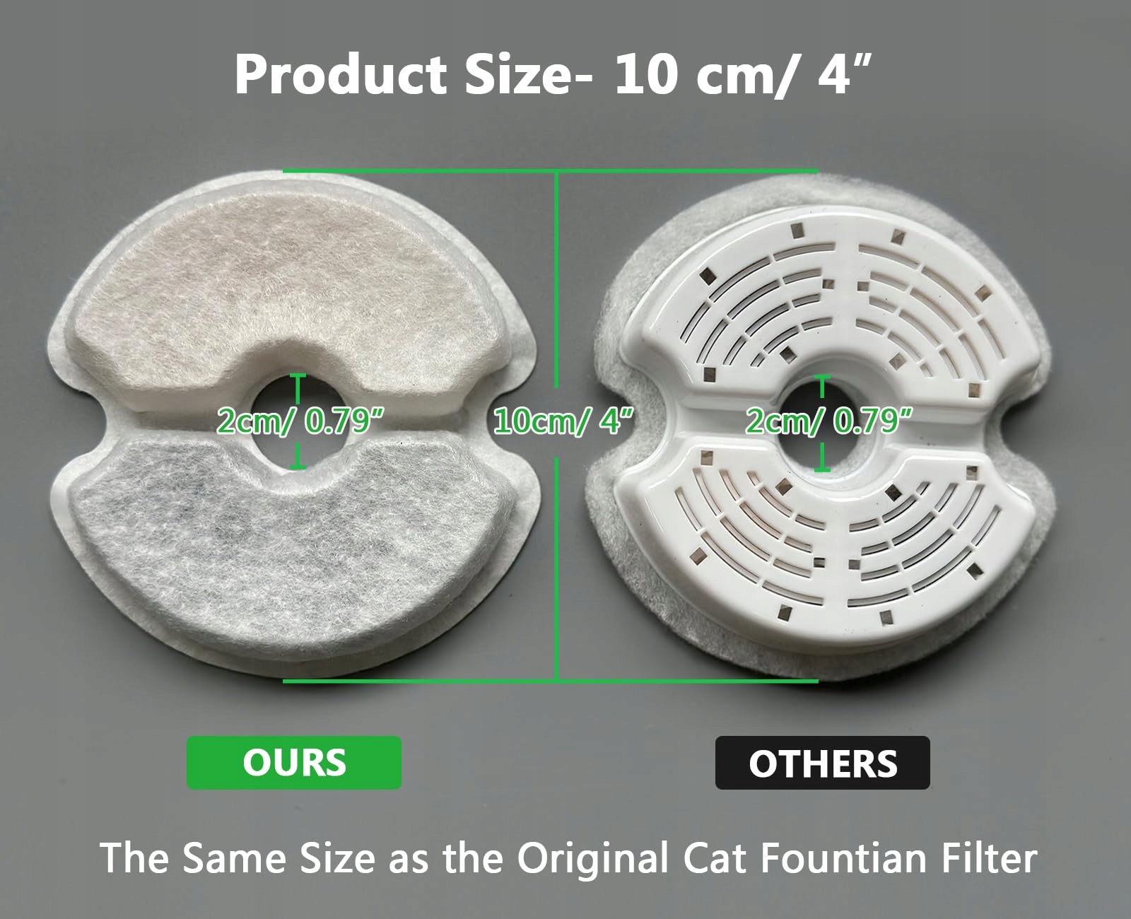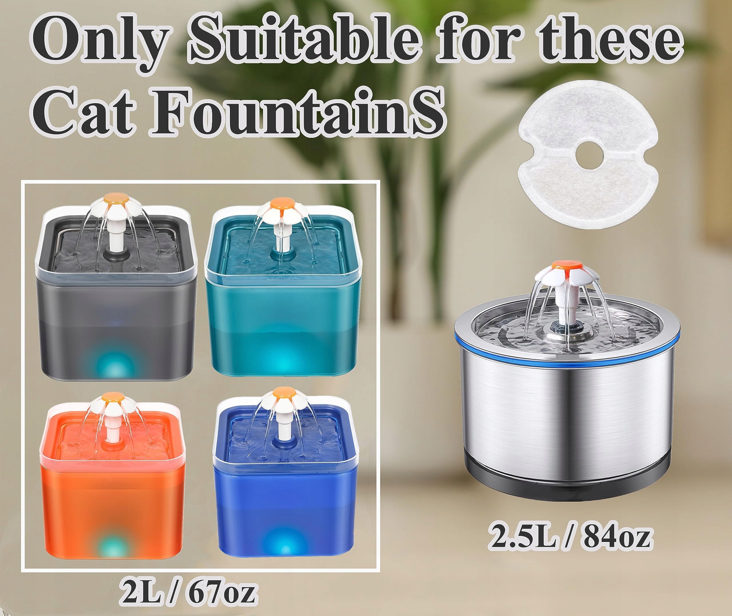 [Dobrze pasuje i łatwy do czyszczenia]Ten filtr do fontanny dla kotów jest idealnie kompatybilny z fontannami o pojemności 2L, 2,5L (67oz, 84oz), jak pokazano na obrazku. (Rozmiar filtra: 10cm/3.9", Rozmiar otworu środkowego: 2cm /0.79"). Przed zakupem upewnij się, że ten filtr do fontanny dla kotów jest kompatybilny z Twoją fontanną.
