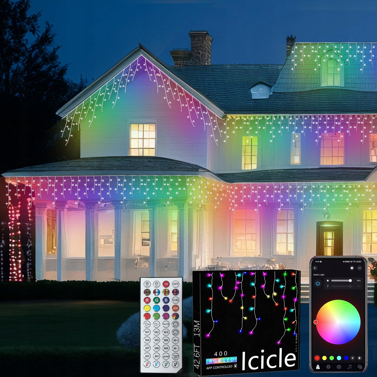 Oświetlenie świąteczne na zewnątrz, łańcuch świetlny z soplami 13M, 400 LED RGB 16 milionów kolorów, inteligentne oświetlenie świąteczne z aplikacją do sterowania dla salonu, domu, łańcuch świetlny, dekoracja świąteczna