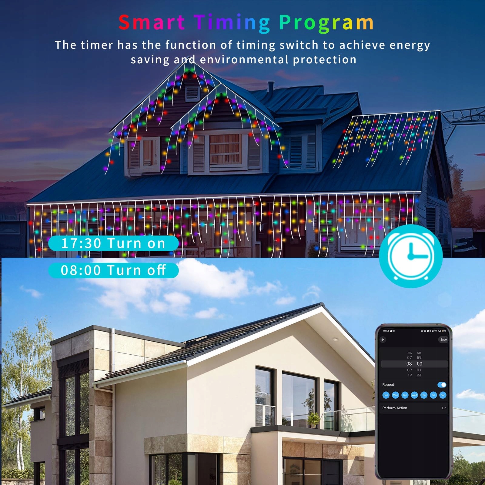Inteligentny łańcuch świetlny nowoczesny design: Sopel i łańcuchy świetlne są sprytnie połączone i bardziej unikalne niż zwykłe łańcuchy LED. Synchronizuj z muzyką i obserwuj, jak Twoje światła tańczą. Dzięki temu subtelne, inteligentne światła soplami wprowadzają zauważalny lub różnorodny nastrój z urokiem do wnętrza lub na zewnątrz.