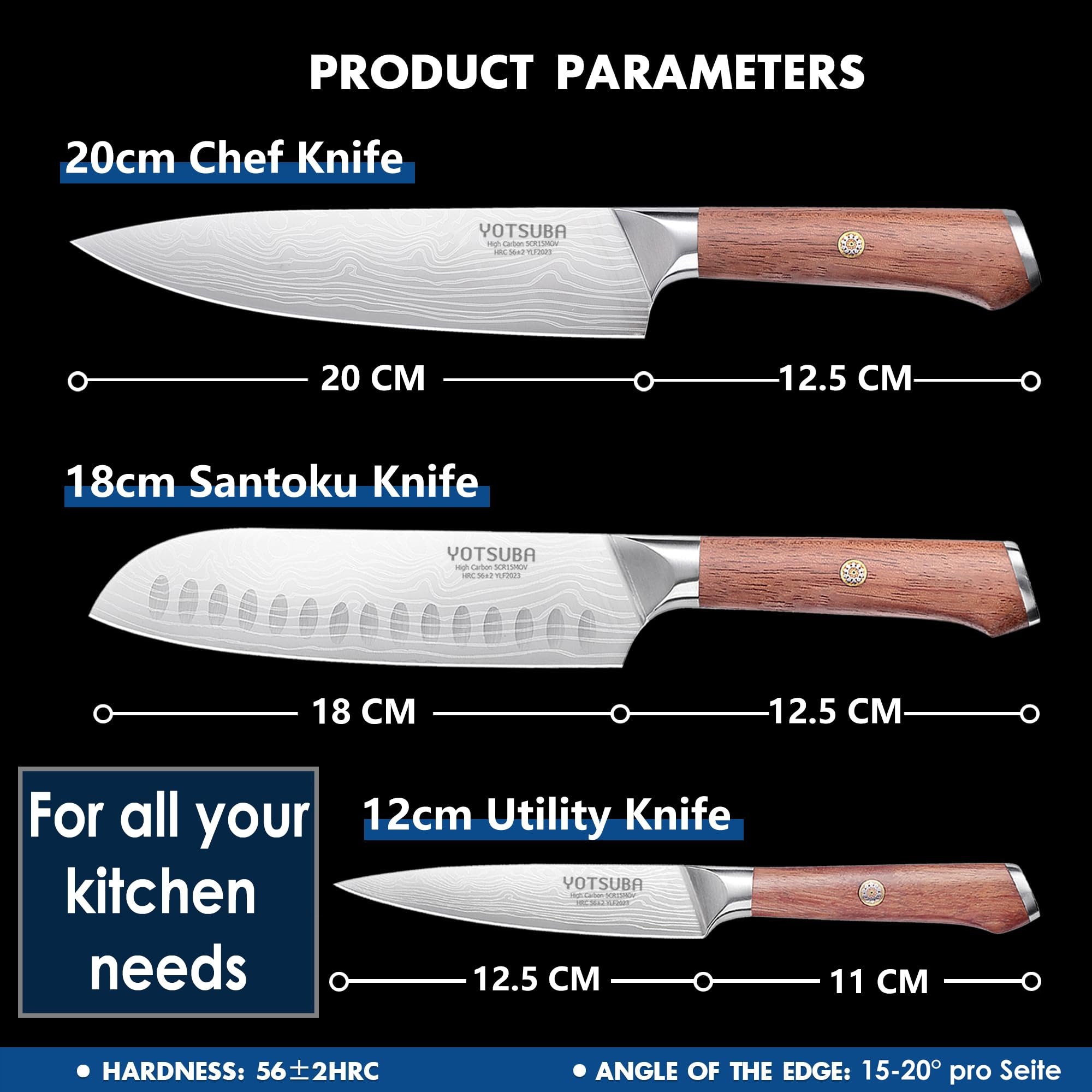 ZESTAW NOŻY YOTSUBA, Zestaw noży kuchennych 3-częściowy z wysokiej jakości stali węglowej, ultra ostre noże z nożem szefa kuchni, nożem Santoku, nożem uniwersalnym