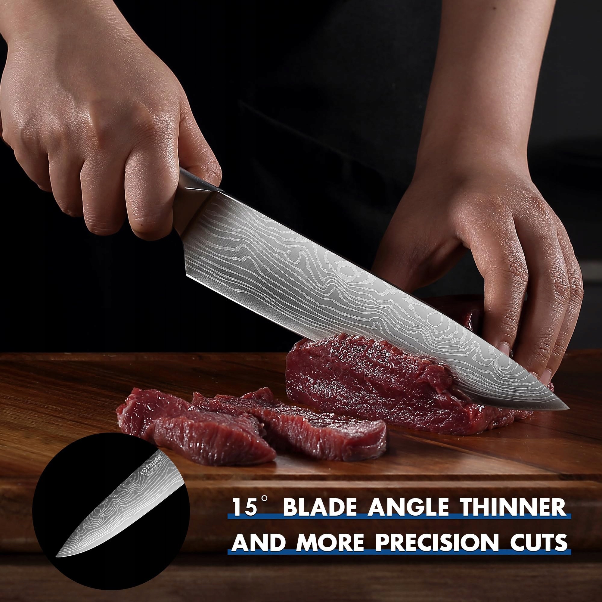 ULTRA OSTRE OSTRZE: Te zestawy noży są wykute z niemieckiej stali 5Cr15Mov, która ma zawartość węgla wynoszącą 0,5%. Dzięki temu twardość ostrza osiąga 56 ± 2 Rockwella. Przy starannym ostrzeniu przez naszych profesjonalnych rzemieślników kąt ostrza osiąga 15-20 stopni z każdej strony. Połączenie maksymalnej ostrości i trwałości krawędzi zapewnia precyzyjne i bezwysiłkowe cięcie przy każdym użyciu