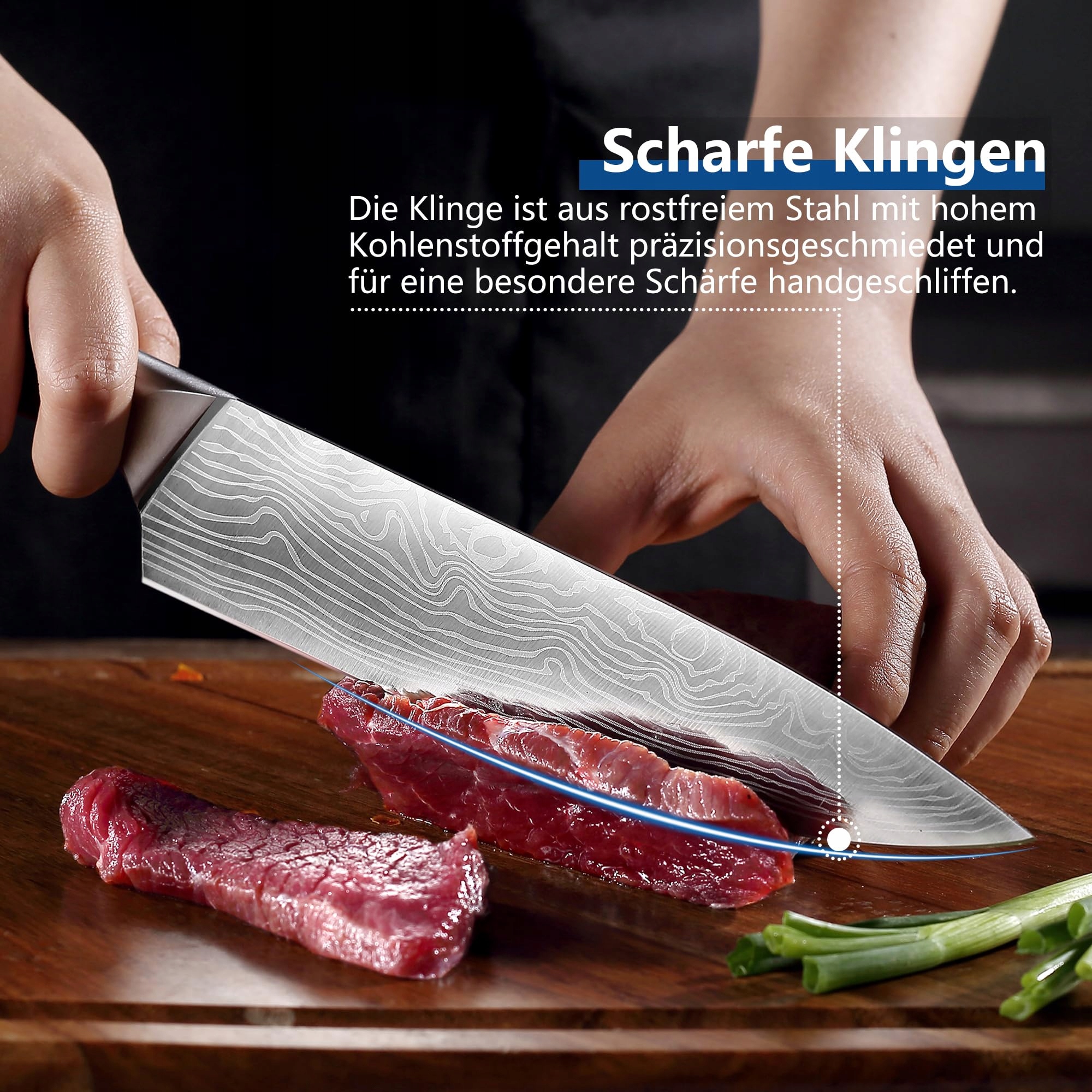Łatwe w pielęgnacji: Aby zmaksymalizować wydajność i trwałość swoich noży kuchennych, zestaw noży można spłukać ciepłą wodą i łagodnym mydłem; dobrze spłukać i całkowicie osuszyć miękkim ręcznikiem. Nie wkładać do zmywarki ani nie moczyć w wodzie przez dłuższy czas.