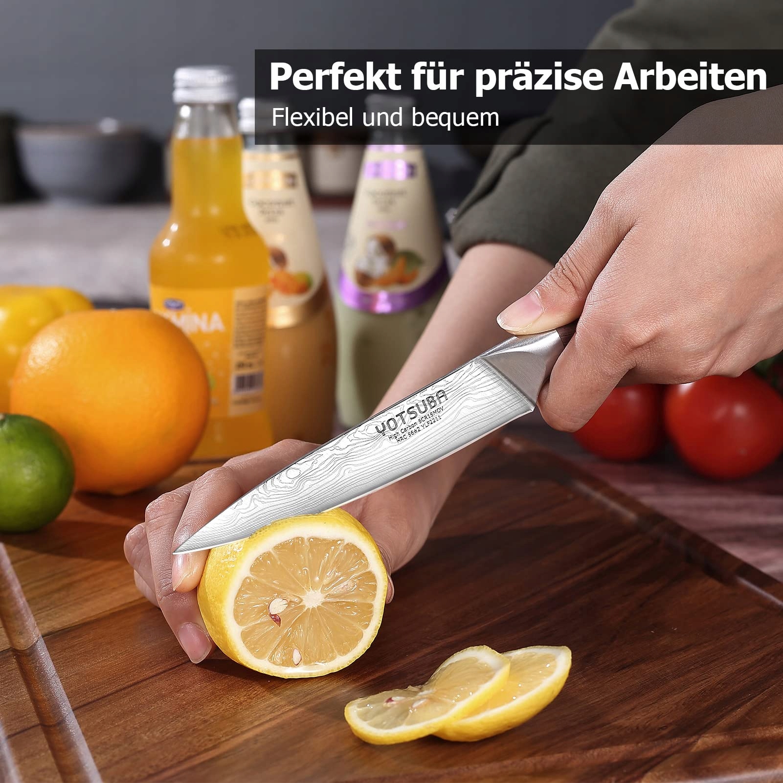 Wygodny uchwyt: Ten mały nóż kuchenny z ergonomicznym uchwytem z drewna Pakka zapewnia antypoślizgowy chwyt i ułatwia krojenie. Metalowa konstrukcja ramy i kolorowe gwoździe zapewniają dobrą stabilność uchwytu
