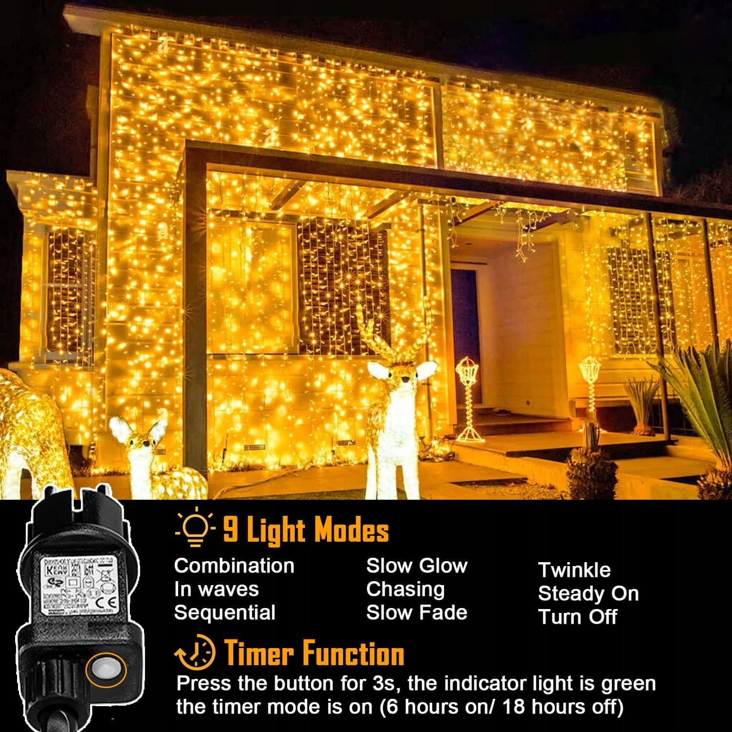 Funkcja łączenia i dostarczone artykuły - Obsługuje połączenie do 4 kurtyn świetlnych, co oznacza, że możesz mieć światło o długości do 12 metrów z 3-metrowym spadkiem, co daje niesamowity efekt dekoracyjny, szczególnie odpowiedni dla dużych centrów handlowych i hoteli. Zawartość opakowania: 300 LED kurtyna świetlna x 1, instrukcja obsługi x 1.