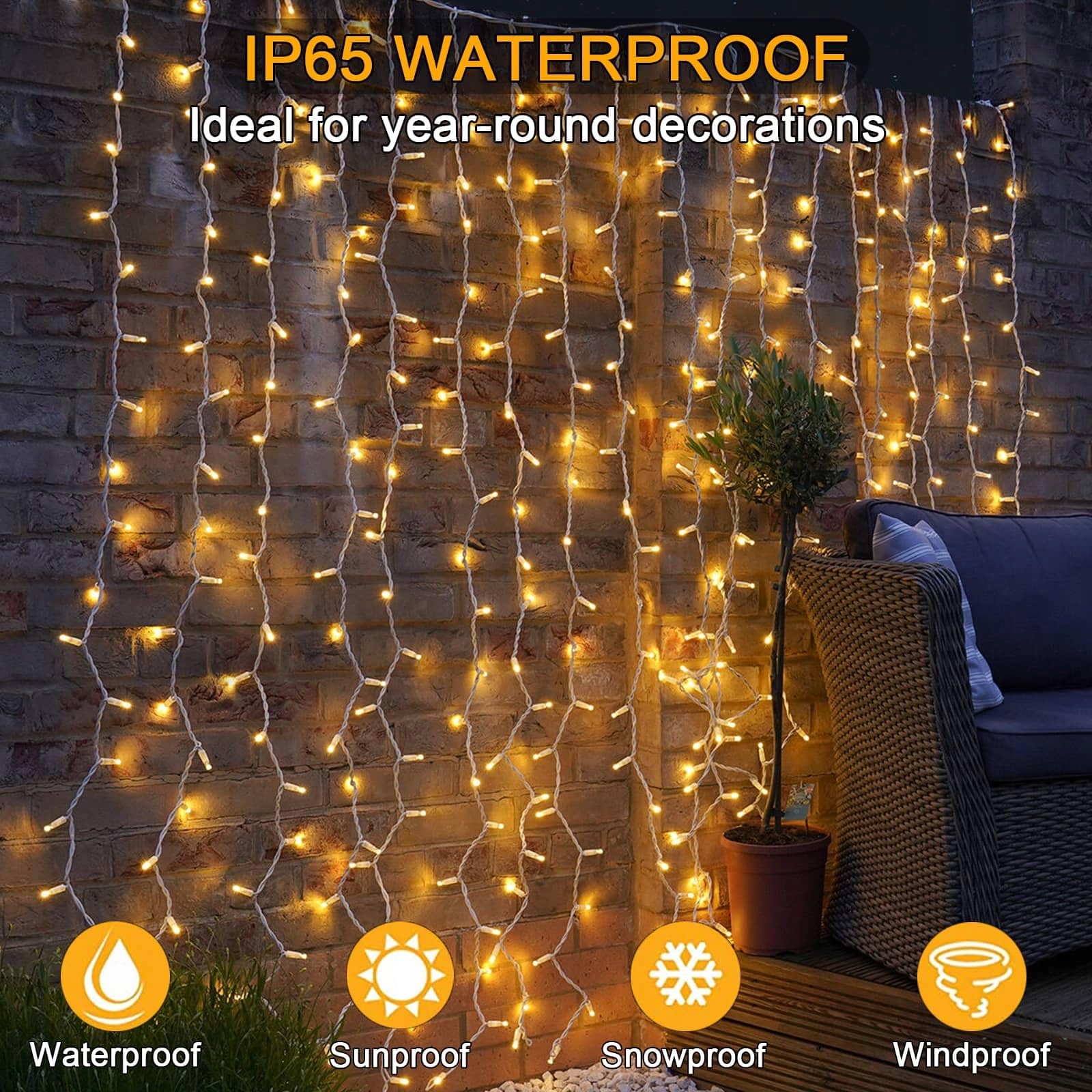 IP65 wodoodporny i energooszczędny - Świąteczne oświetlenie jest wodoodporne IP65, możesz używać łańcuchów świetlnych nawet w deszczowe lub śnieżne dni! Niskie napięcie 31V sprawia, że łańcuchy świetlne są bezpieczne w dotyku i nie przegrzewają się przy dłuższym użytkowaniu. Dekoruj wszystkie świąteczne okazje tymi łańcuchami świetlnymi, twórz świąteczną i romantyczną atmosferę!