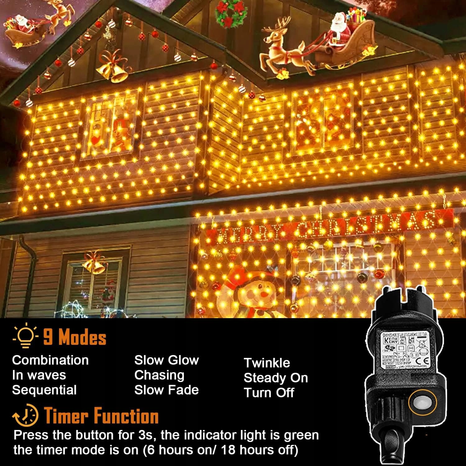 Funkcja timera i oszczędność energii - Naciśnij przycisk na wtyczce przez 3 sekundy, aby włączyć lub wyłączyć funkcję timera. Kontrolka świeci na zielono, aby włączyć tryb timera (6 godzin włączone/18 godzin wyłączone), a kontrolka gaśnie, aby wyłączyć tryb timera. Nie musisz się martwić o marnowanie energii lub zapominanie o wyłączeniu świateł siatki