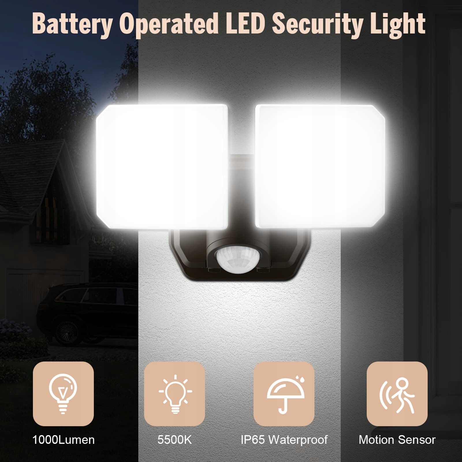 YTKIH Bateria zasilana lampa zewnętrzna z czujnikiem ruchu, 5000K, 1000LM wysoka jasność lampa zewnętrzna, zasięg 49 stóp, bez okablowania, do użytku wewnętrznego i zewnętrznego