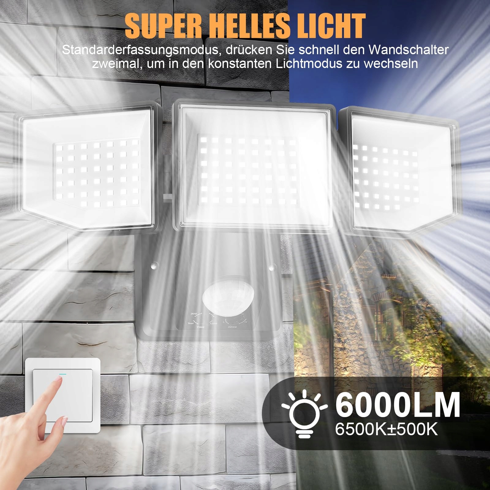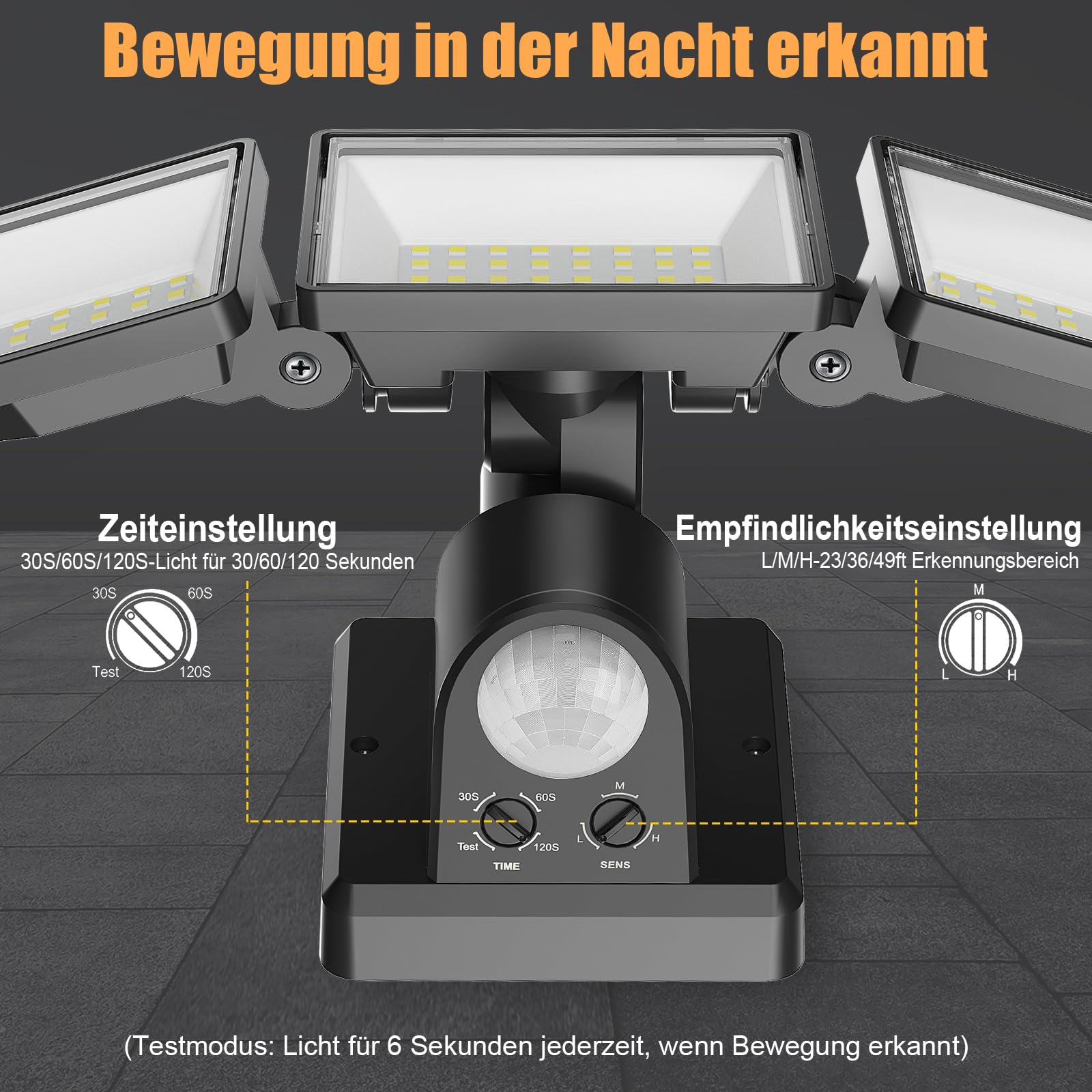 3 regulowane oprawy: Reflektor LED jest wyposażony w 3 regulowane oprawy, które umożliwiają oświetlenie szerokokątne o kącie 270°, dzięki czemu obszar oświetlenia jest powiększony, a całe podwórko może być łatwo oświetlone. Niezależnie od tego, czy przed drzwiami wejściowymi, na podwórku, w garażu, przy basenie czy na podjeździe, łatwo się dostosowuje i rozszerza kąt widzenia.