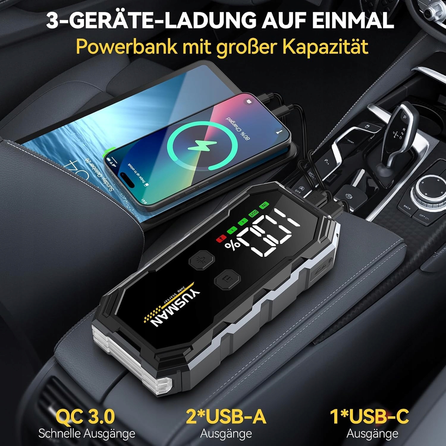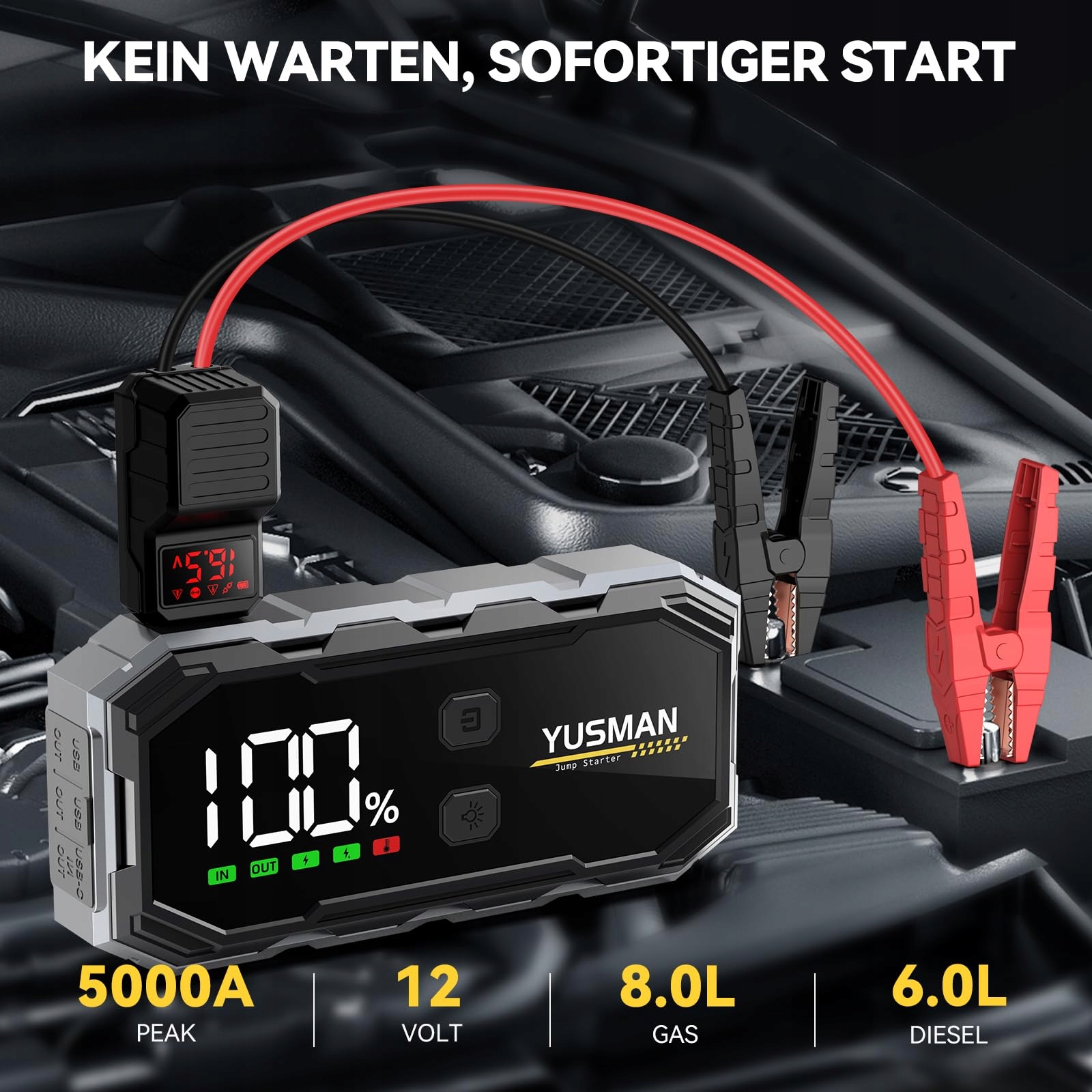YUSMAN Powerbank do rozruchu samochodu dla samochodów osobowych | 5000A 12V Booster akumulatora samochodowego dla 8L benzyny lub 6L diesla z wyświetlaczem LCD i 4 trybami światła LED – Idealny dla SUV, motocykli, kosiarek