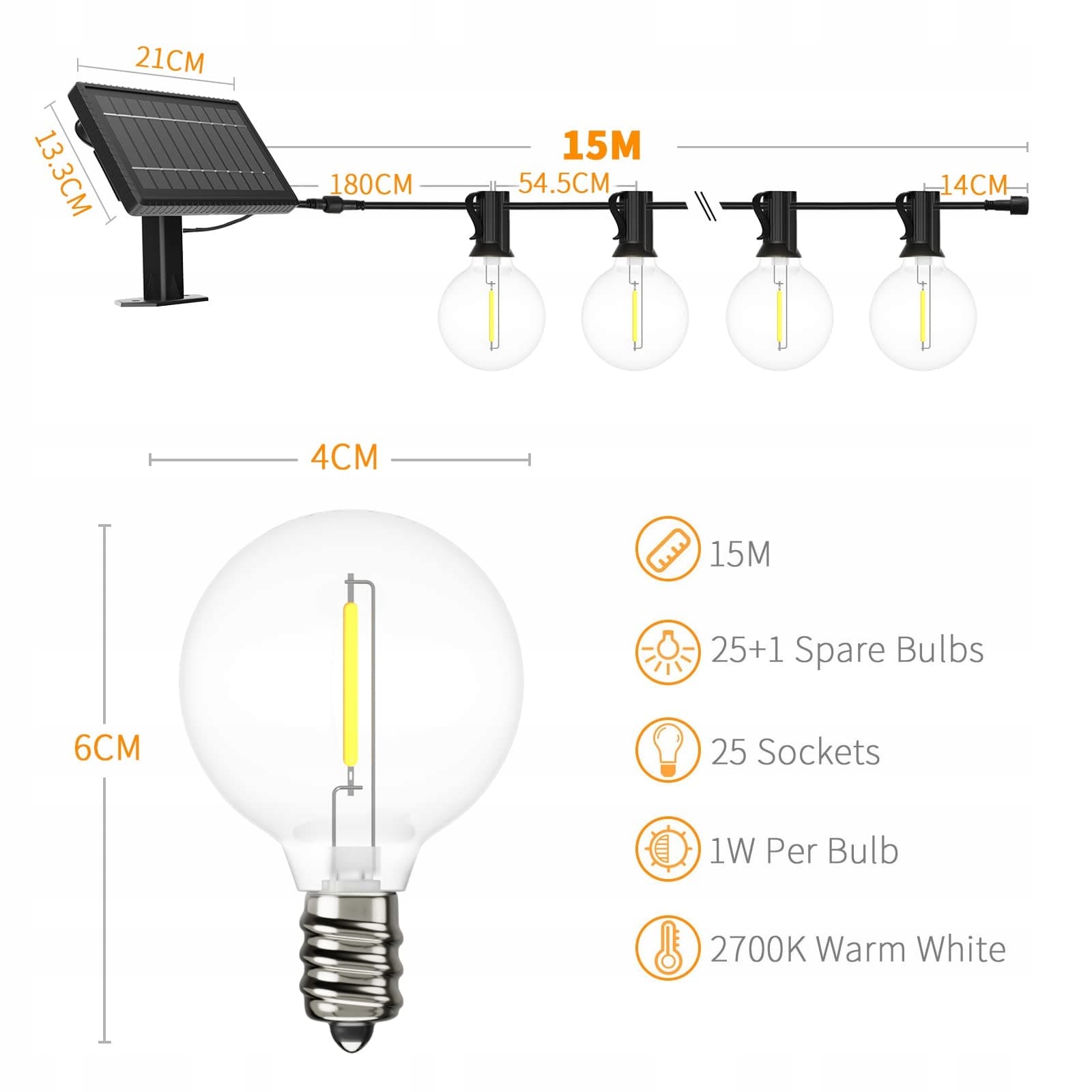 💡[Wysokowydajny panel słoneczny]LED-Lichterkette ma całkowitą długość 15M z 25+1 plastikowymi żarówkami G40 (gniazdo E12). Wbudowany panel słoneczny z hartowanego szkła zapewnia doskonałą wydajność ładowania przy słabym świetle. Jest to MUST-HAVE akcesorium dla Twojego domu! Te solarne łańcuchy świetlne na zewnątrz są również świetnym prezentem dla bliskich.