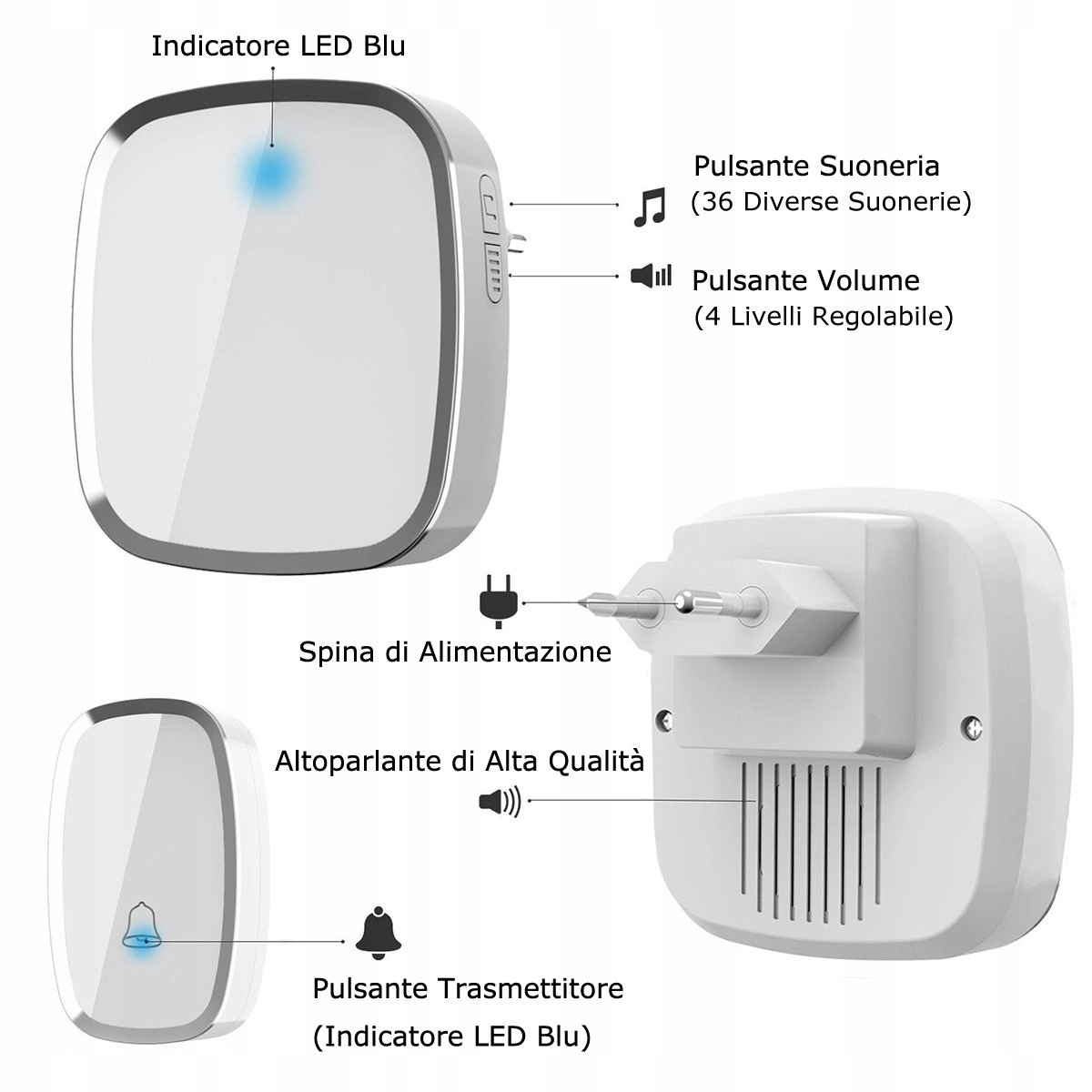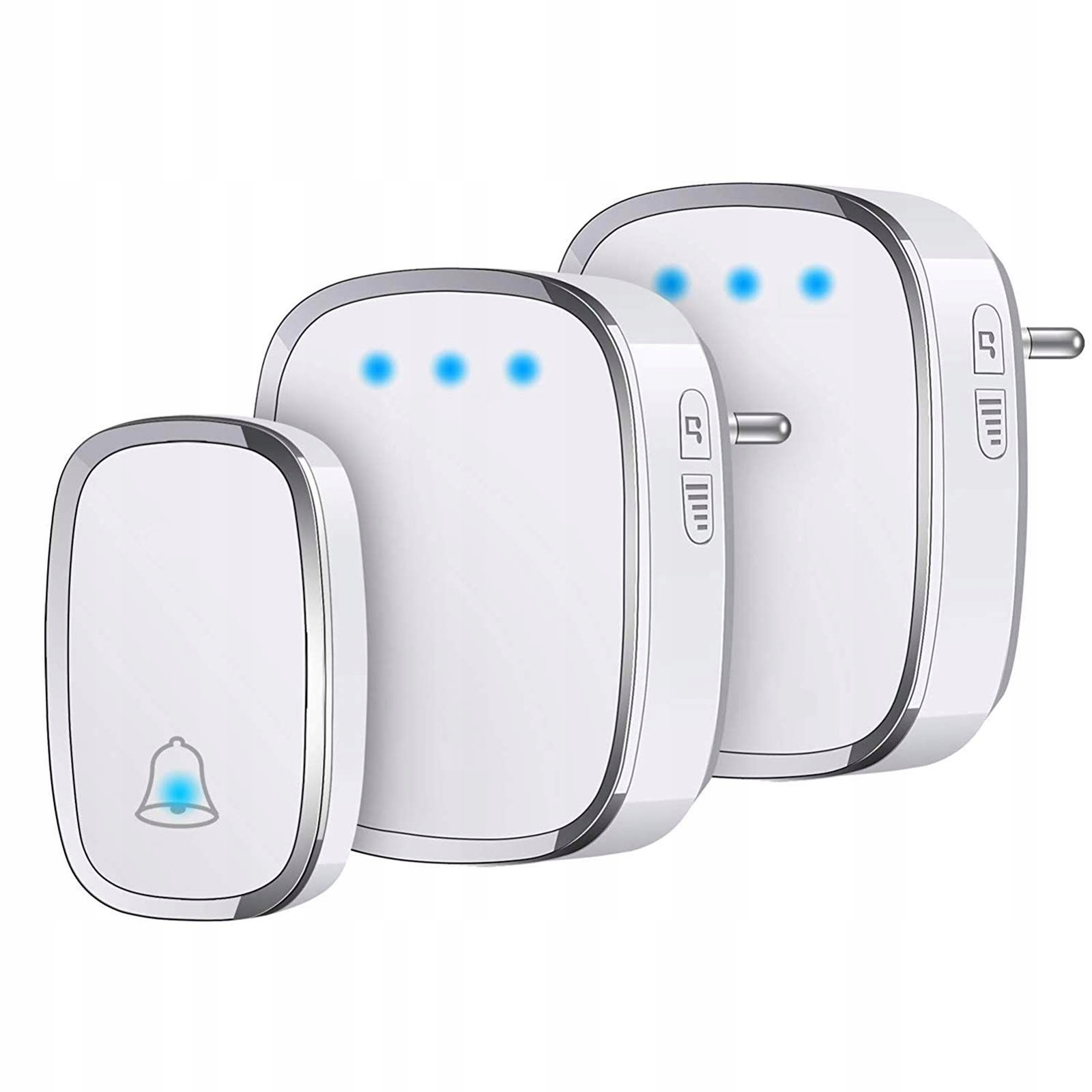 Wyświetlacz LED: Dzwonek (nadajnik) i odbiorniki mają lampki sygnalizacyjne, gdy ktoś naciśnie dzwonek, wszystkie trzy urządzenia migają niebieskim światłem. 36 dzwonków do wyboru, 5 poziomów głośności od 0 dB do 85 dB.