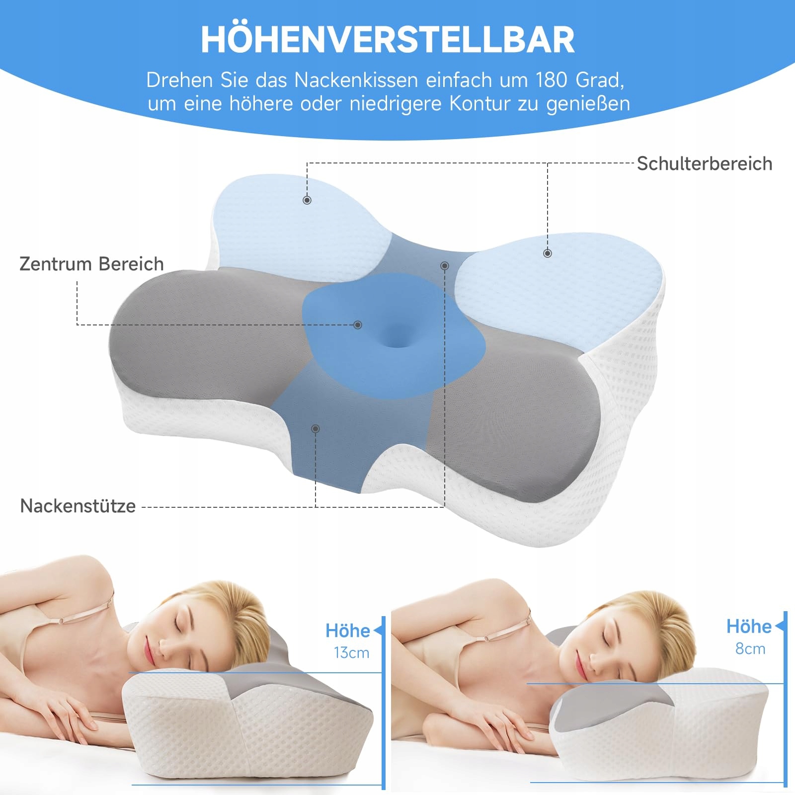 [Wielofunkcyjny design]Ta poduszka z pianki memory oferuje dwa różne poziomy wysokości. Poduszka do spania ma wymiary 60 x 13 / 8 x 36 cm. Nasza poduszka została zaprojektowana do różnych pozycji snu i może być używana jako poduszka do spania na plecach, brzuchu lub boku. Kształt motyla i centralna komora dostosowują się do krzywizn ludzkiego ramienia i głowy, a rozsądne strefowe podparcie rozkłada nacisk i zapewnia dobre wsparcie.