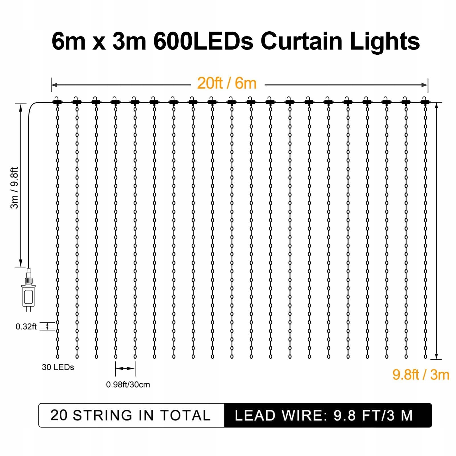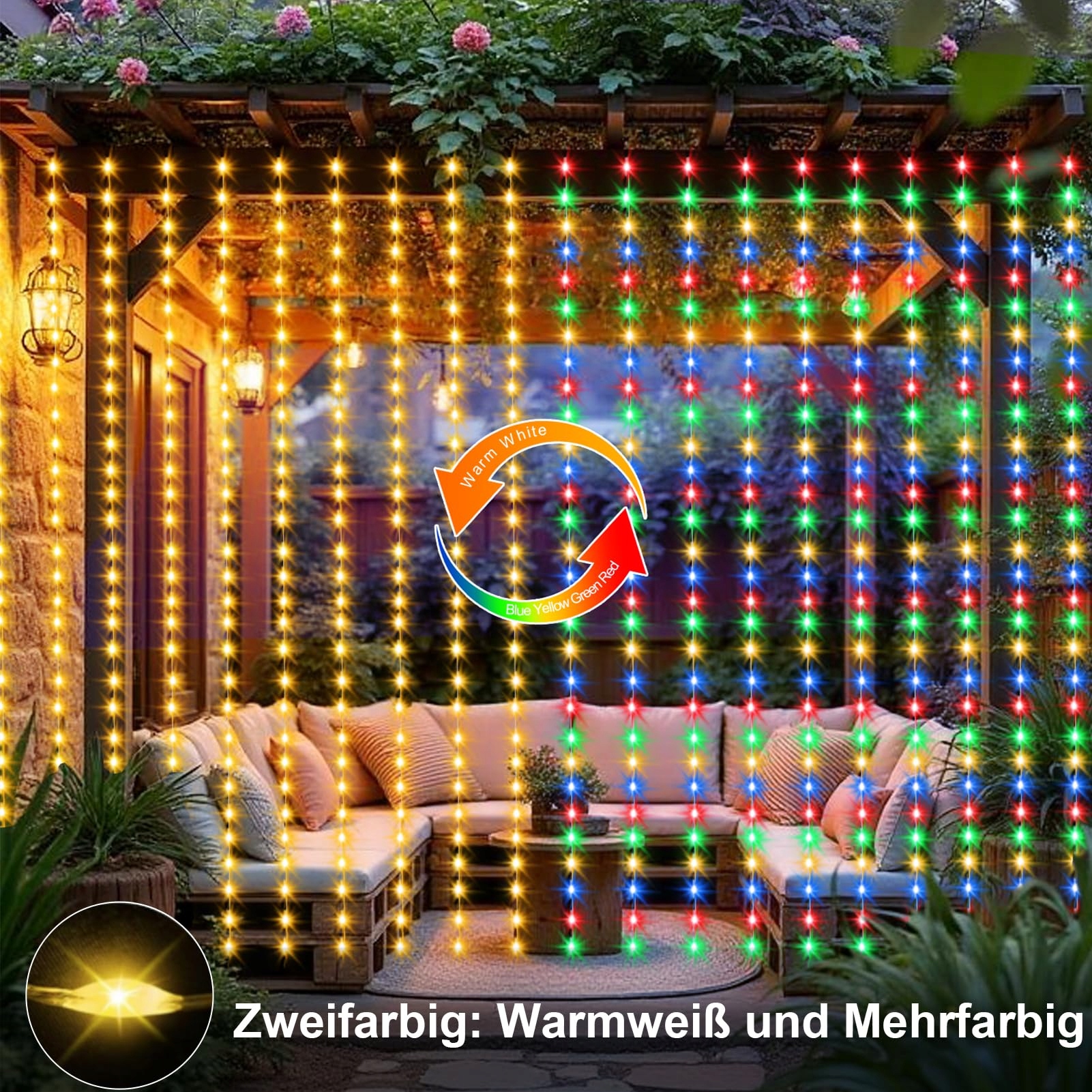 Kurtyna świetlna z podwójną zmianą koloru: 6m (szerokość) x 3m (wysokość). 600 diod LED dużej kurtyny świetlnej można przełączać na ciepłą biel lub wielokolorowe. Idealna dekoracja do wnętrz i na zewnątrz na wesele, ścianę sypialni, okno, taras, ogród, dekoracje świąteczne
