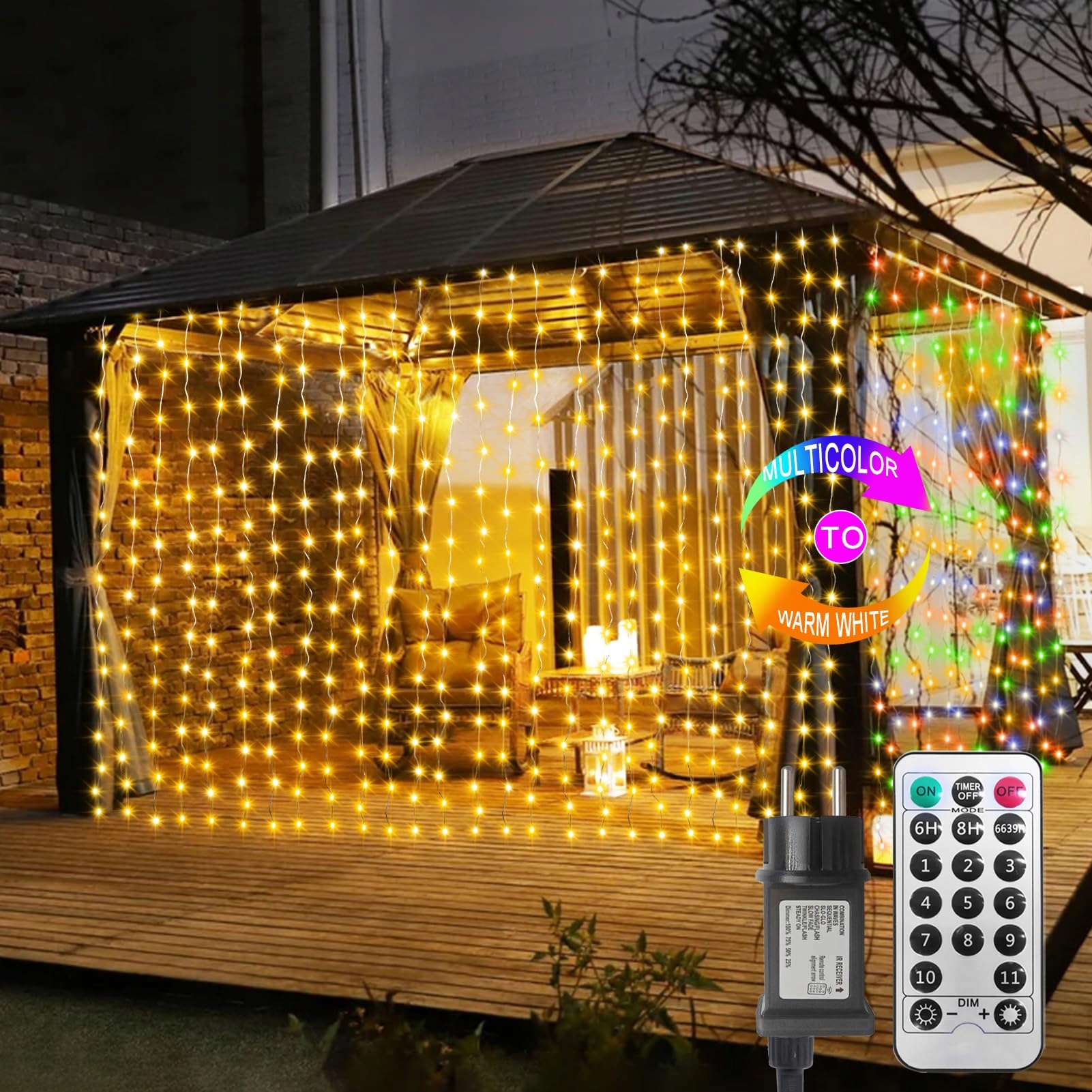 Wodoodporność IP68: Wodoodporne kurtyny świetlne nadają się do dekoracji zewnętrznych, takich jak podwórka, tarasy, altany, korytarze, namioty, pawilony, drzewa, ogrodzenia, Halloween i Boże Narodzenie. (Zasilacz musi być suchy)