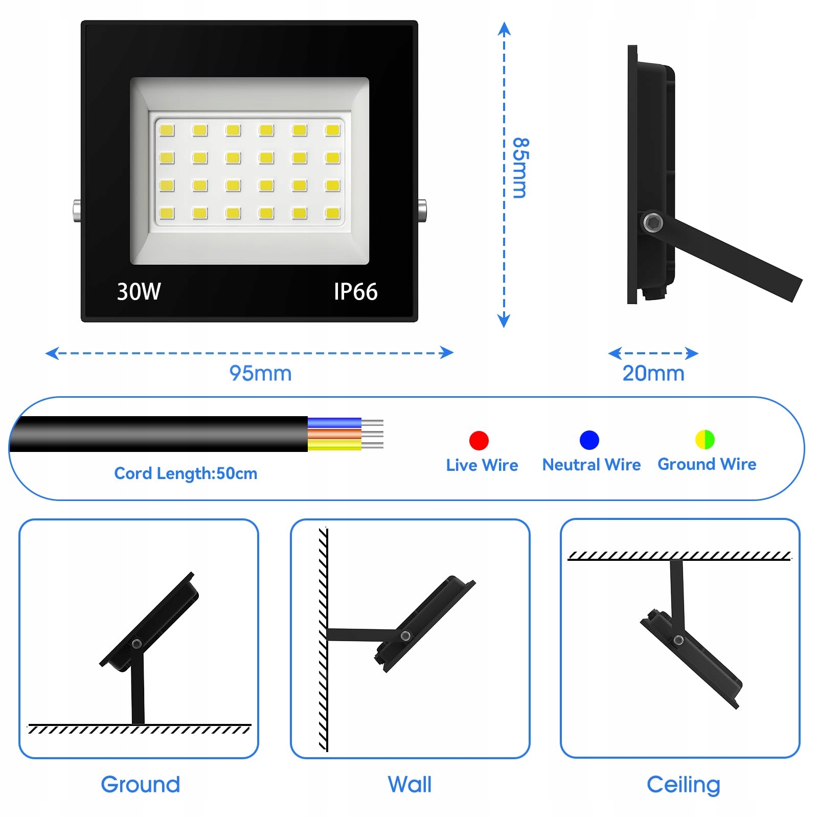 Łatwy montaż: Gruby metalowy uchwyt sprawia, że reflektor LED jest stabilniejszy. Każda zewnętrzna lampa LED wyposażona jest w 50 cm długi, wysokiej jakości gumowy kabel oraz regulowany uchwyt, który umożliwia łatwy montaż na ścianach, sufitach lub podłogach, co ułatwia instalację i nie ogranicza miejsca ani pozycji. Szeroki obszar oświetlenia i wysoka jasność (w zestawie śruby)