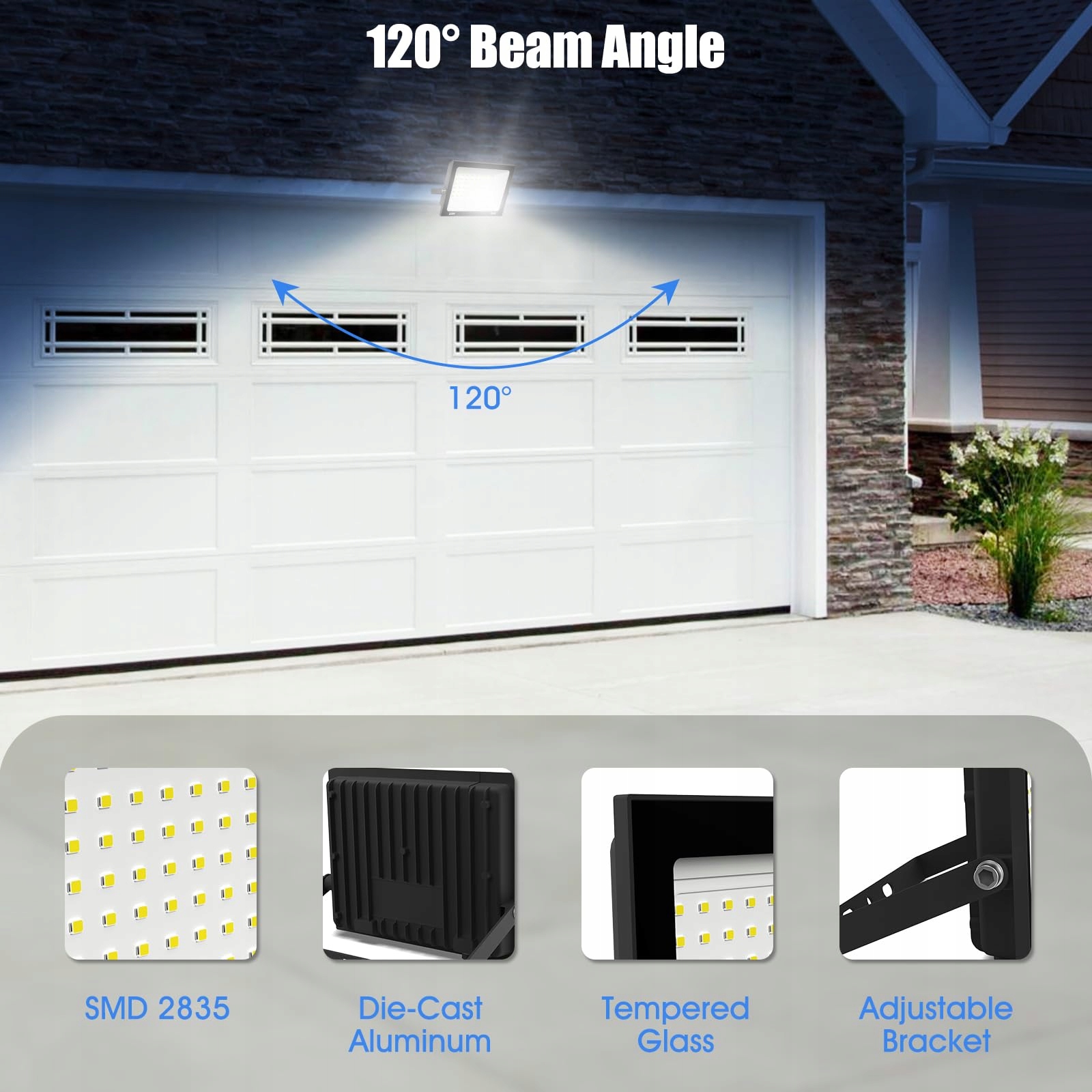 Szeroki kąt świecenia i duży obszar oświetlenia: Reflektor LED ma kąt świecenia 120°, co zapewnia szeroki zakres oświetlenia. Reflektory LED wykorzystują diody 2835 SMD oraz nowy reflektor, który powiększa obszar oświetlenia i redukuje niepożądane odbicia i załamania światła oraz poprawia jasność o 30%. Dzięki wysokiej jakości diodom LED ten zewnętrzny reflektor LED działa do 50000 godzin.