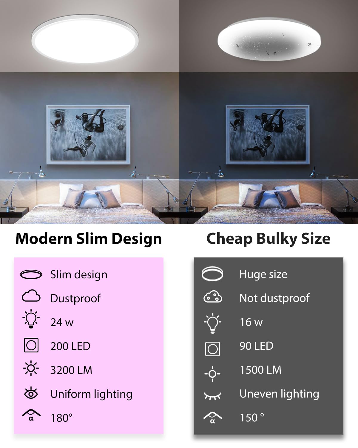 【Specjalna lampka nocna + tryb timera】- Jako lampka nocna minimalna jasność ściemniona światła LED może osiągnąć 10 % przy 3000 K ciepłej bieli. Dzieci lub osoby starsze czują się bezpieczniej w nocy dzięki spokojnemu, przytulnemu źródłu światła. Funkcja timera umożliwia automatyczne wyłączenie oświetlenia sufitowego po 60 sekundach przed snem.