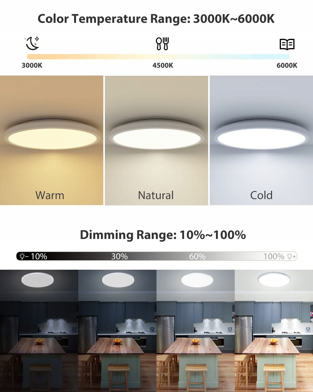 【Ściemniana jasność + 3 tryby kolorów】Główne światło tych lamp LED sufitowych ma 3 temperatury barwowe (Ciepła biel 3000K, Naturalna biel 4000K, Dzienna biel 6500K). Zakres jasności można również ustawić między 10 % a 100 %. Różne poziomy jasności i temperatury barwowe mogą lepiej spełniać Twoje wymagania oświetleniowe.