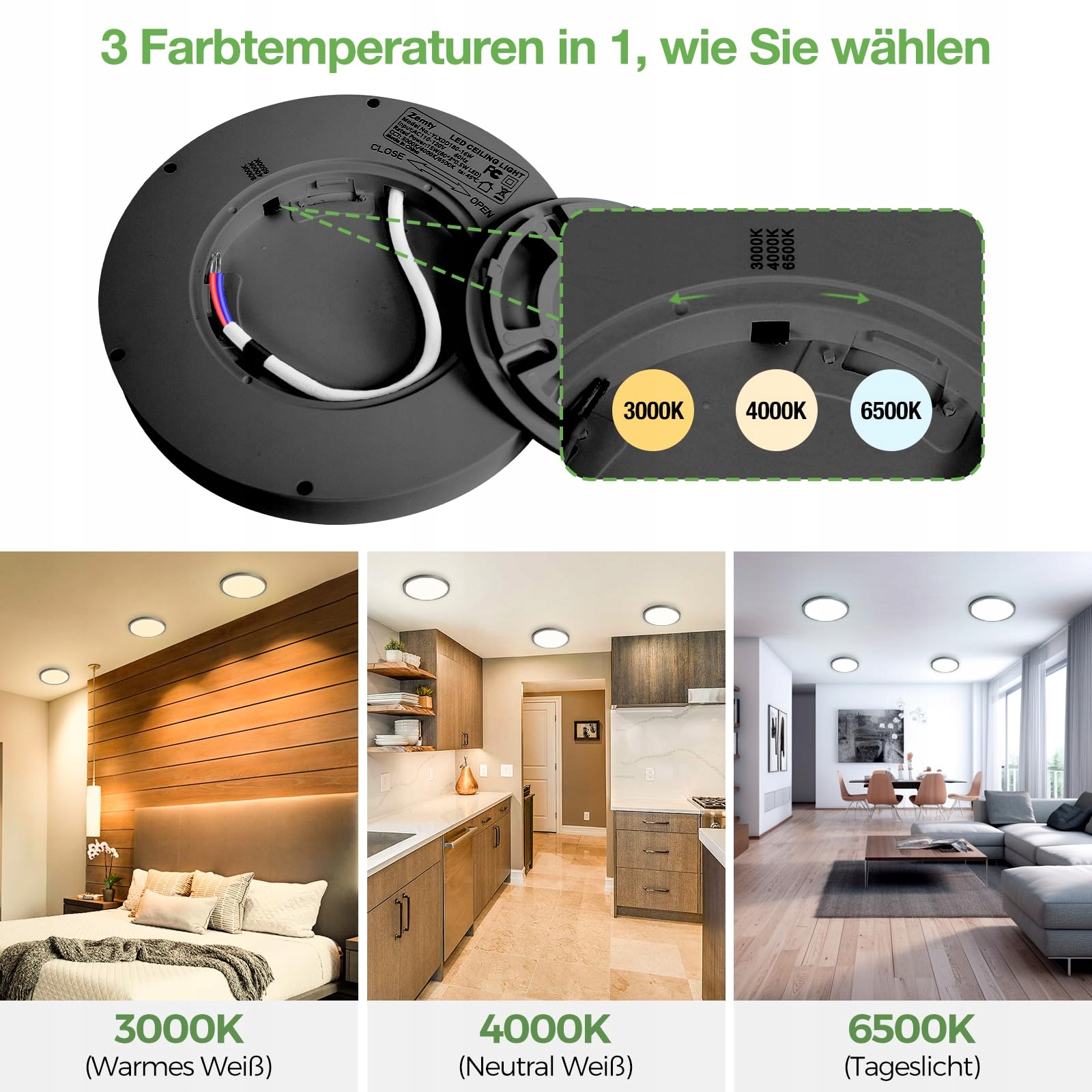 3 kolory do wyboru: Ta lampa sufitowa ma trzy temperatury barwowe (3000K Ciepła biel/4000K Naturalna biel/6500K Dzienna biel), wystarczy przesunąć przycisk z tyłu, jak pokazano w reklamie, aby wybrać swoją ulubioną temperaturę barwową, która przyniesie Ci idealny efekt świetlny