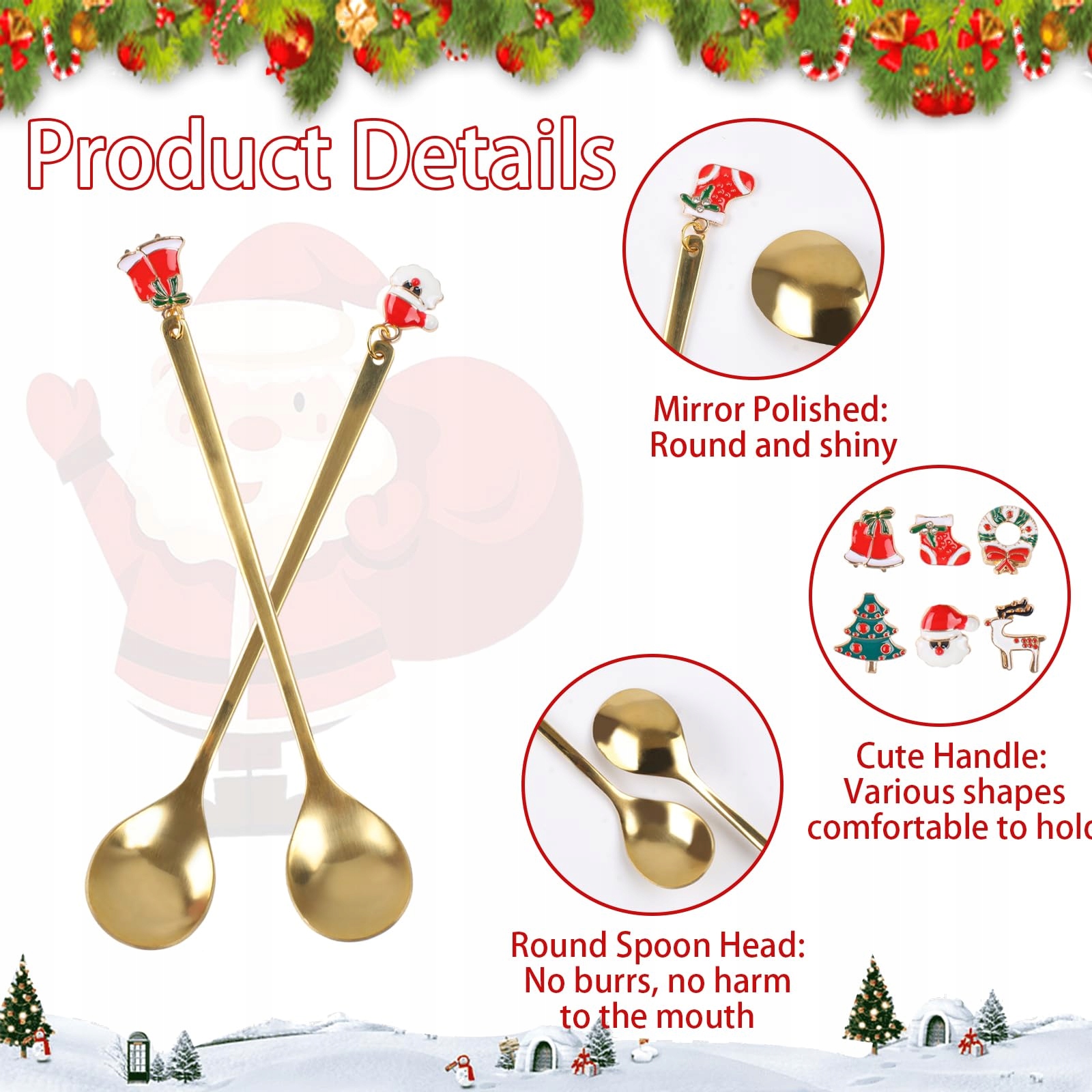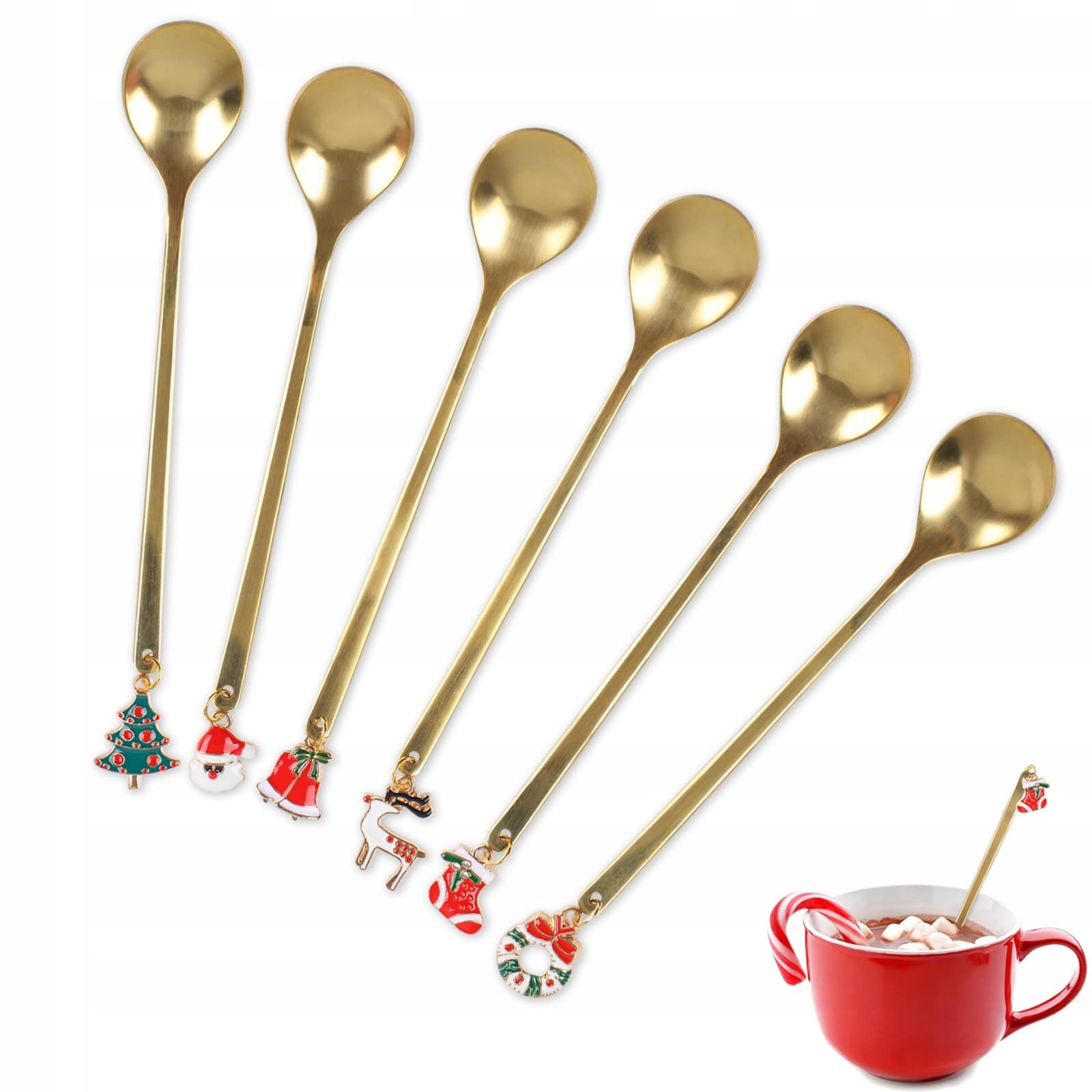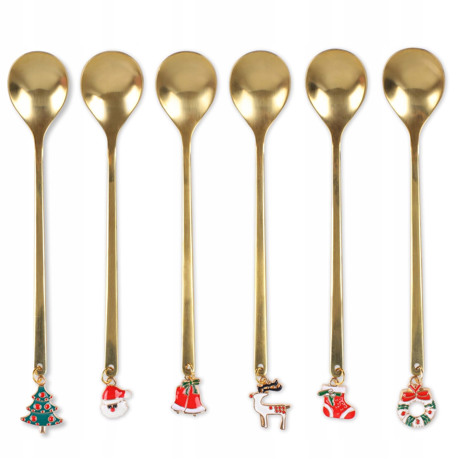 Zestaw 6 łyżeczek świątecznych, łyżeczki ze stali nierdzewnej, łyżeczki do kawy w stylu świątecznym, małe łyżeczki do deserów do kawy, herbaty, deserów, lodów, dekoracje stołu na przyjęcia (złoty wisiorek)