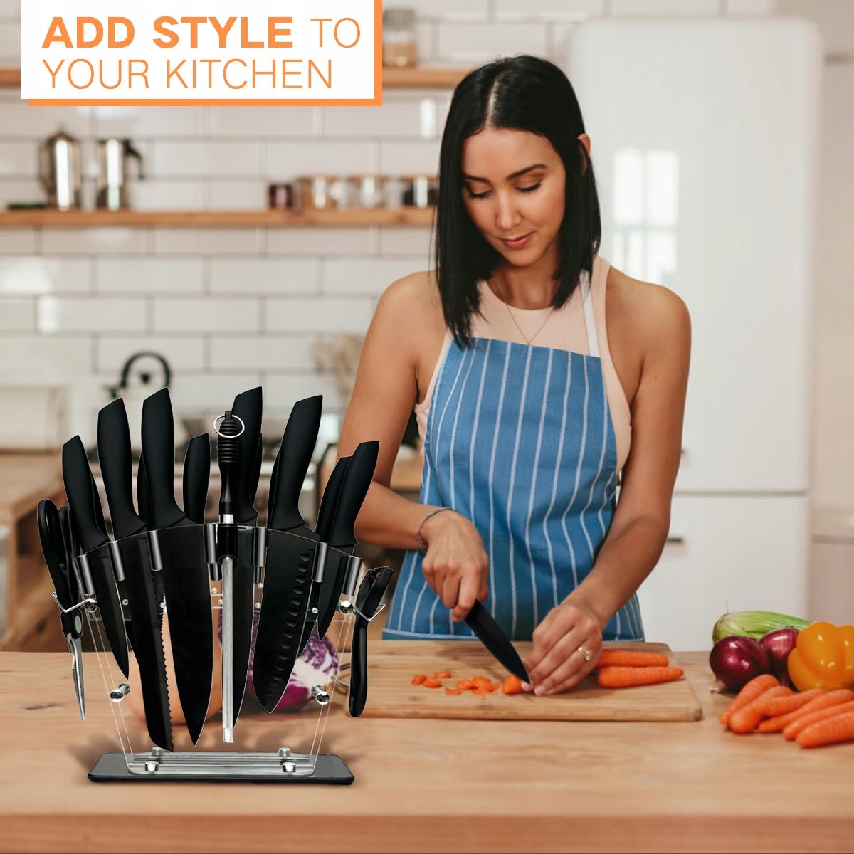 Wszystkie noże kuchenne są zorganizowane w drewnianym bloku, który wykonany jest z trwałej naturalnej sosny. Zestaw noży kuchennych należy myć ręcznie i nie używać zmywarki, a następnie przechowywać bezpiecznie w drewnianym bloku na noże.