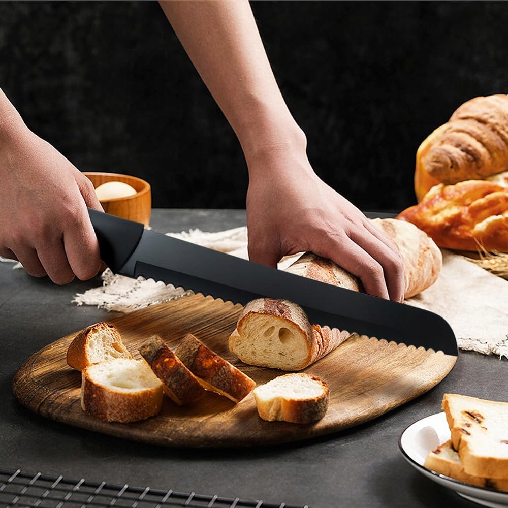 Ten zestaw noży wykonany jest ze stali nierdzewnej o wysokiej zawartości węgla, ultraostre ostrze z powłoką nieprzywierającą jest odporne na rdzę i zarysowania. Wykute w ten sposób noże kuchenne nie łatwo się wyginają, mogą długo utrzymywać doskonałą ostrość i mają długą żywotność.