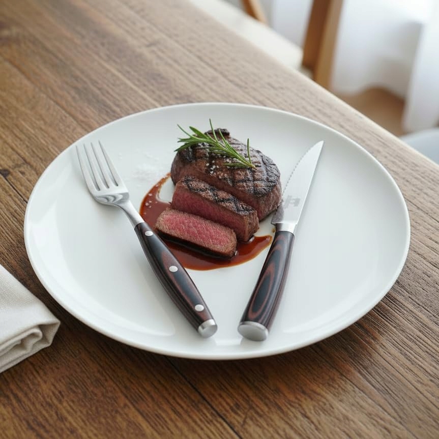 Stal nierdzewna i ergonomiczne drewniane uchwyty: Noże i widelce wykonane są z trwałej stali nierdzewnej. Ergonomiczne uchwyty z drewna Pakka zapewniają bezpieczne i wygodne użytkowanie podczas krojenia i serwowania.