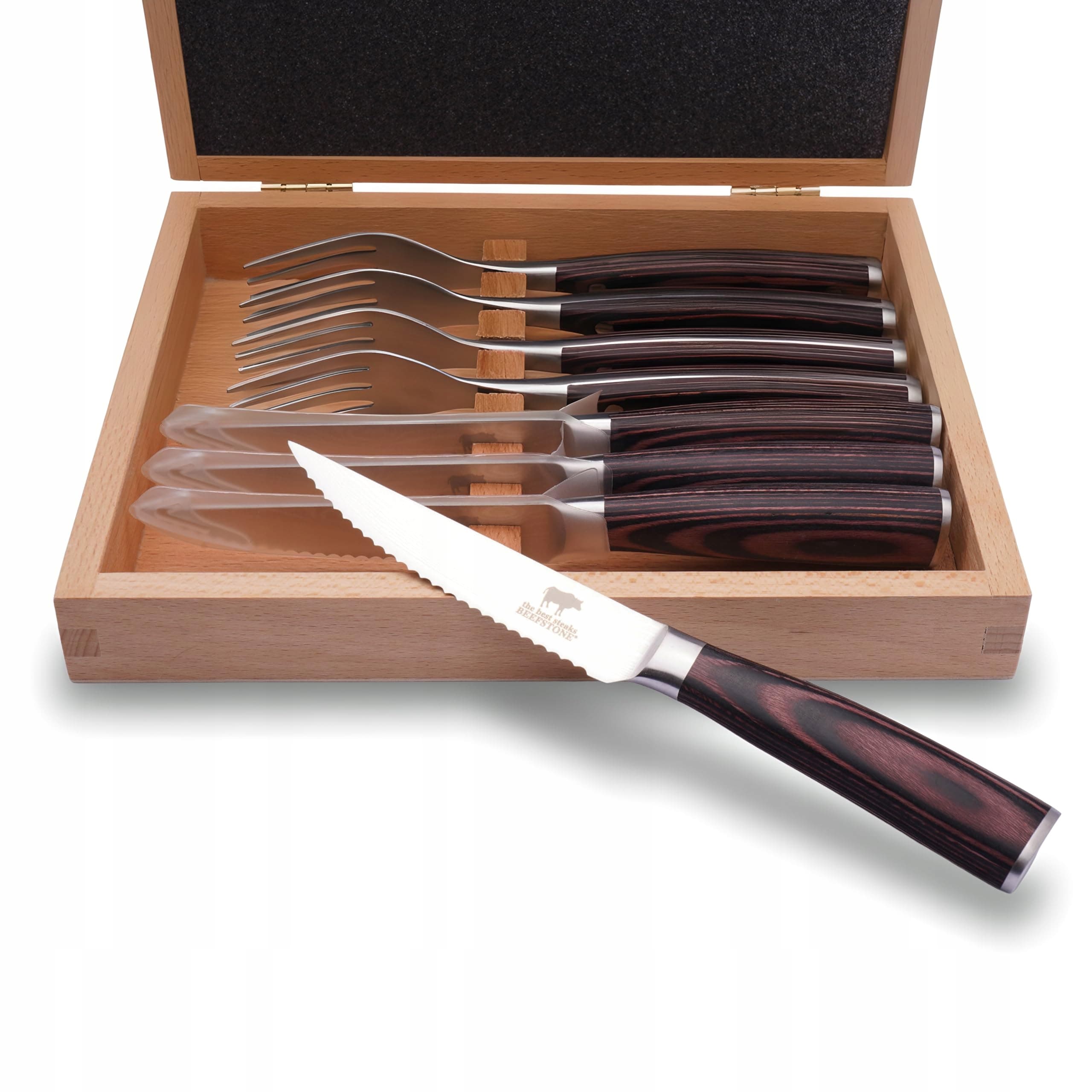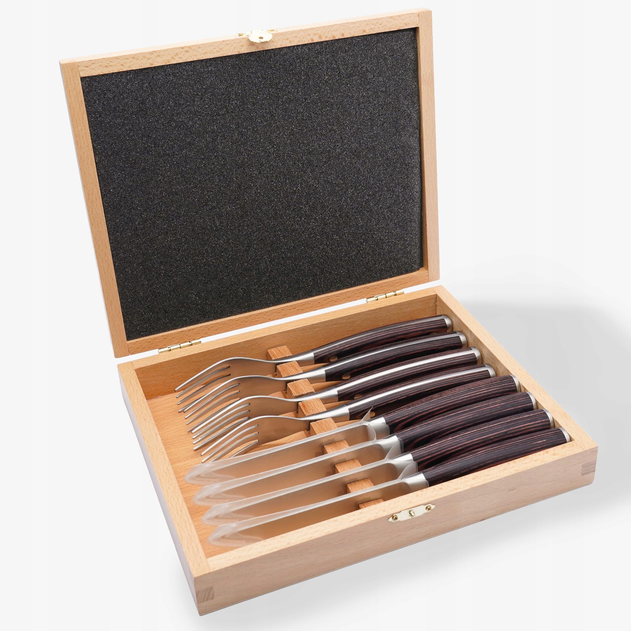 Zestaw sztućców do steków BEEFSTONE, 8-częściowy, 4 noże do steków z ostrzem falistym + 4 widelce do steków, ergonomiczne uchwyty z drewna Pakka, drewniane pudełko na prezent