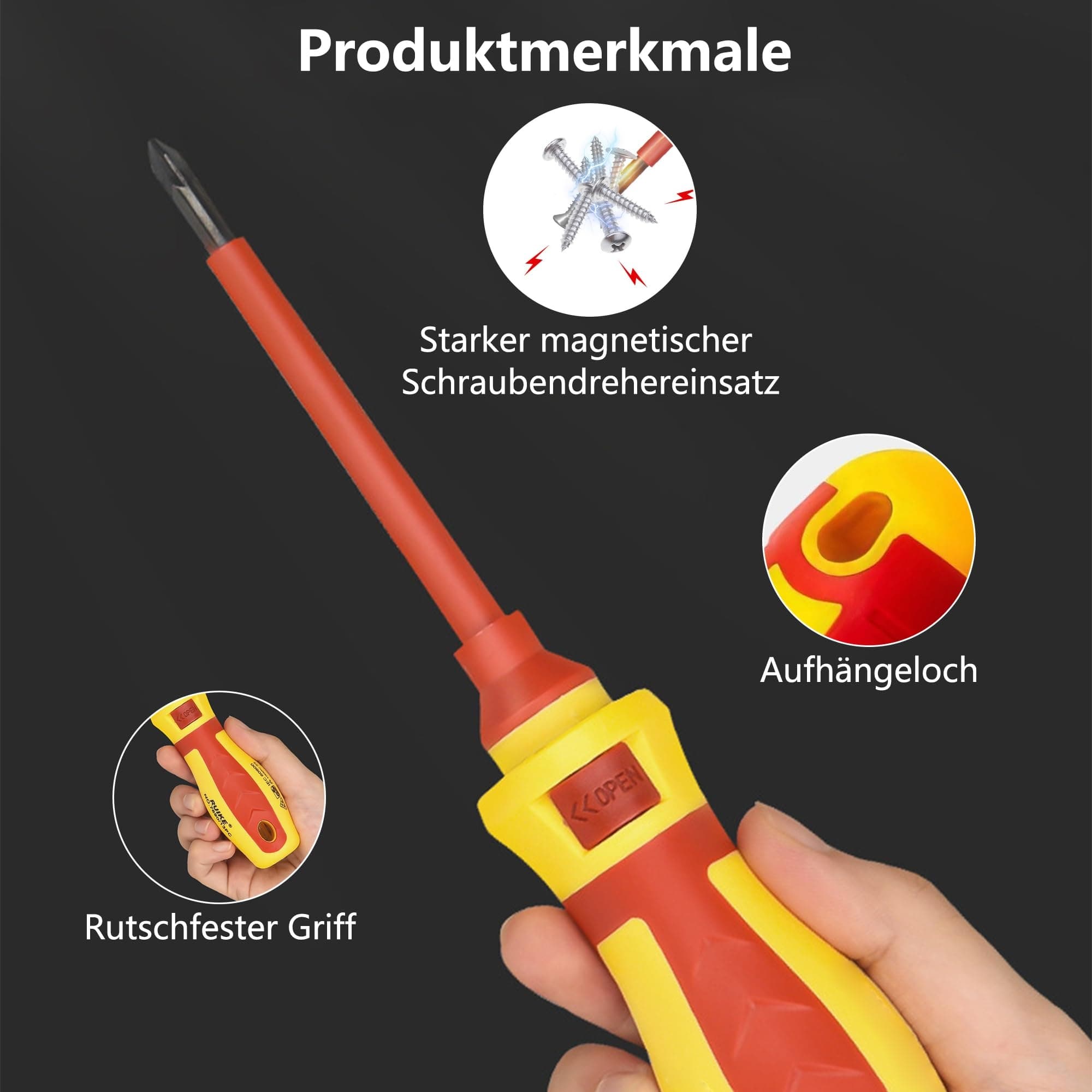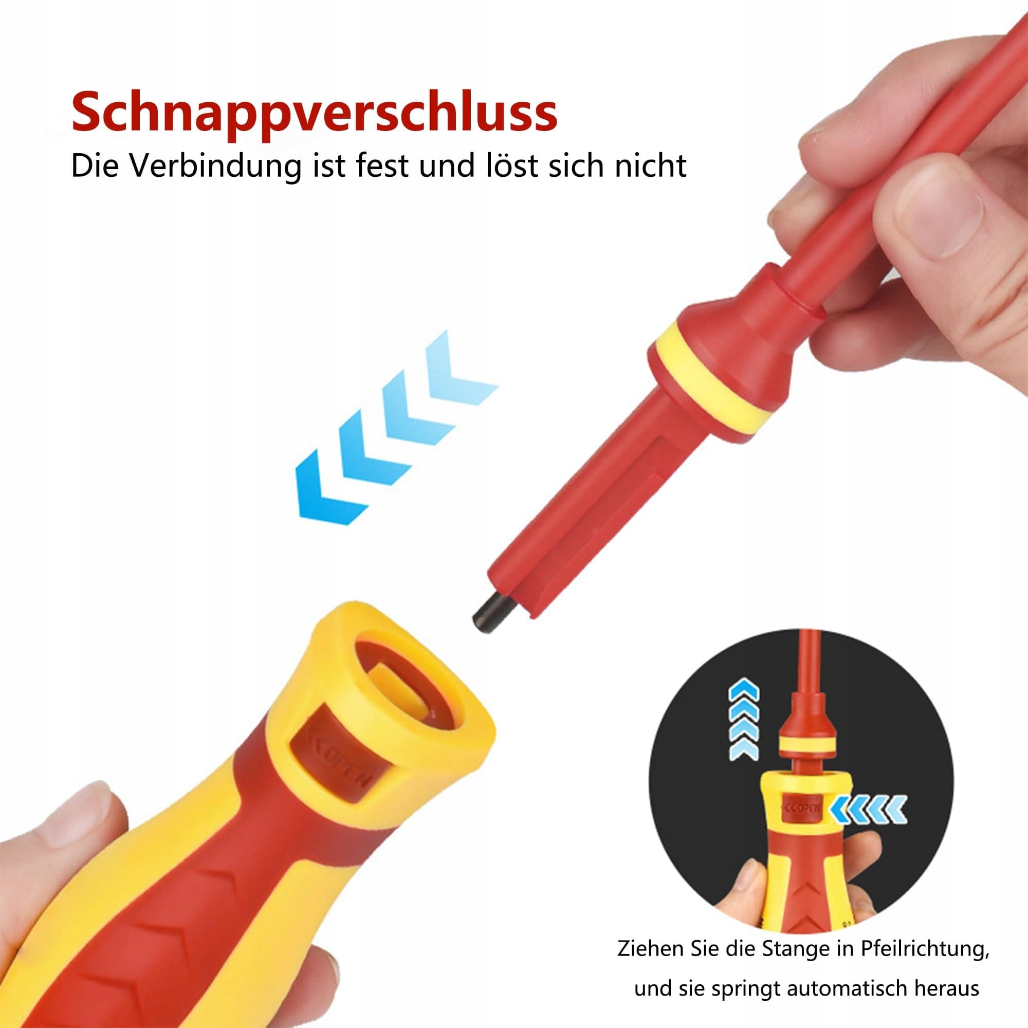 𝐙𝐚𝐛𝐞𝐳𝐩𝐞𝐳𝐧𝐚 𝐏𝐫𝐚𝐜𝐚 𝐝𝐨 𝐈𝐬𝐨𝐥𝐚𝐜𝐣𝐨𝐧: Dzięki izolowanym uchwytom, które wytrzymują do 1000 V, zestaw wkrętaków nadaje się idealnie do prac elektrycznych. Magnetyczne końcówki ułatwiają precyzyjne prowadzenie i dokręcanie śrub.
