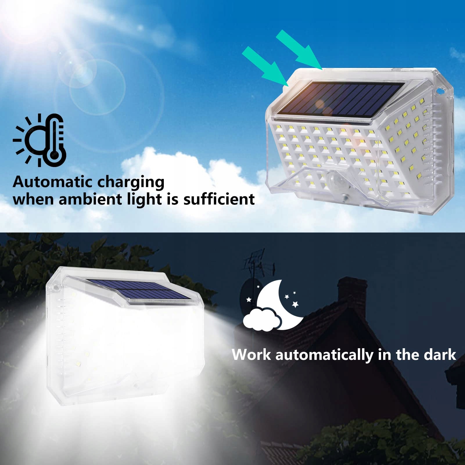 💡[Trzy tryby]: Korpus lampy tych solarnych lamp zewnętrznych wyposażony jest w czujnik ruchu, podczas gdy panel solarny wyposażony jest w czujnik światła otoczenia. Możesz zmienić tryb za pomocą wbudowanego przycisku lampy zewnętrznej: 1. Światło ciągłe; 2. Mocne światło przy ruchu, słabe światło bez ruchu; 3. Mocne światło przy ruchu, wyłączone bez ruchu.