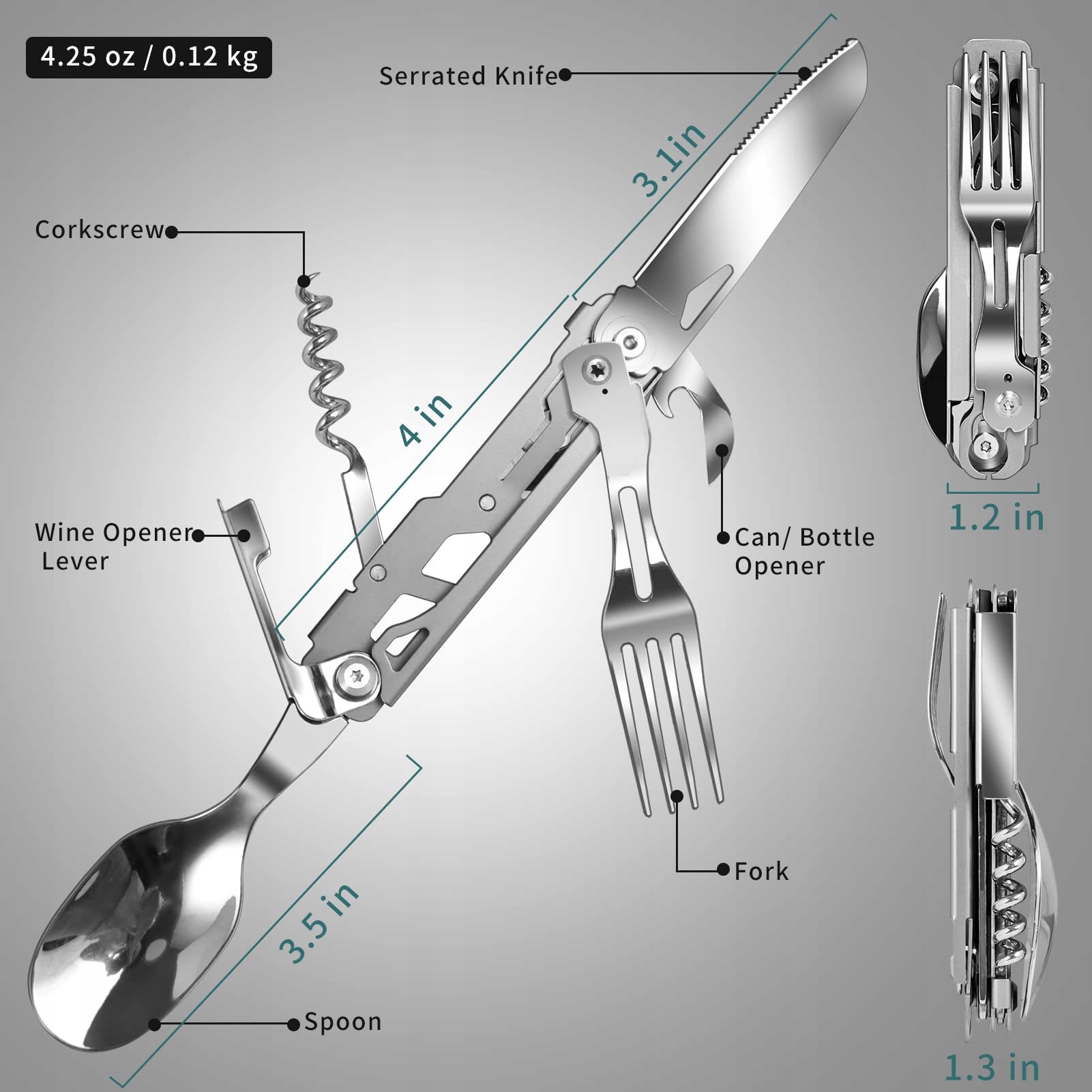 【5-w-1 wielofunkcyjne składane sztućce】Zawiera nóż, widelec, łyżkę, korkociąg do wina i otwieracz do puszek/korkociąg. Przenośny zestaw wielofunkcyjnych sztućców na kemping na zewnątrz oszczędza miejsce i ułatwia przenoszenie.
